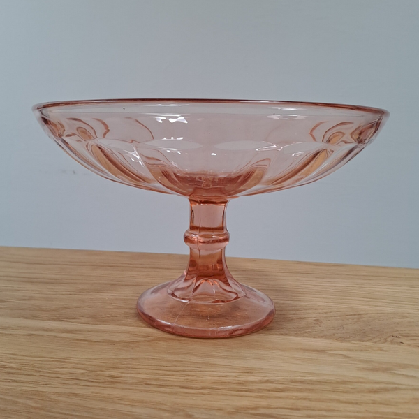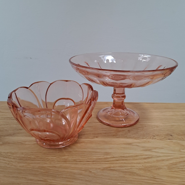 Beschrijving : Mooie set in roze geperst glas, bestaande uit een schaal op voet, en een kleinere schaal met hoge randen.