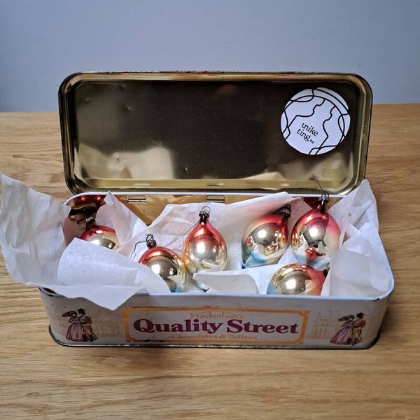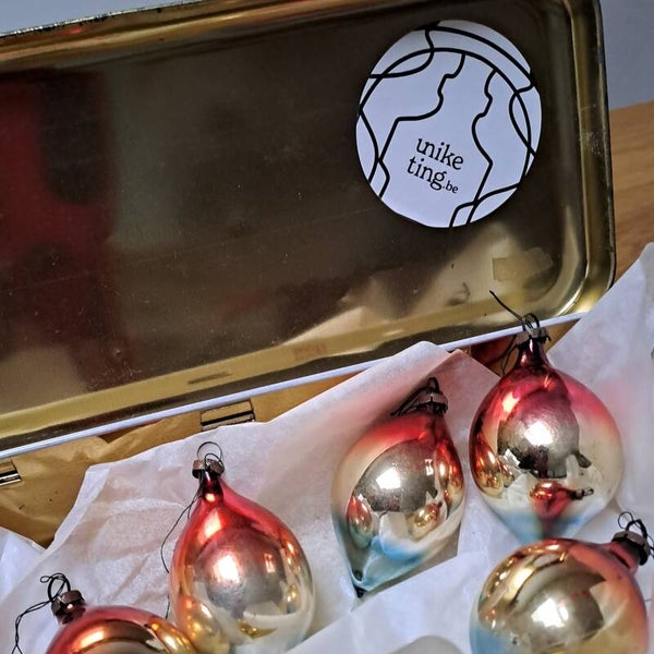 Een beetje historiek?! : Als ik chat GPT mag geloven (ja, soms zijn we ook modern, maar meestal vintage ;) ) gaan glazen kerstballen terug tot de 16e eeuw in Duitsland. Deze zijn uiteraard niet zo oud, maar komen toch uit een tijd dat ze nog niet in grote massa werden geproduceerd, en dus echte ambachtskunstwerkjes zijn. Zelf met maar een paar van deze in je kerstboom krijgt ie alvast wat meer cachet. Of zet de blikken doos met wat lichtjes op je tafel, en je interieur schittert...