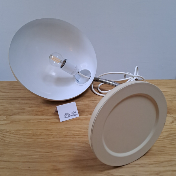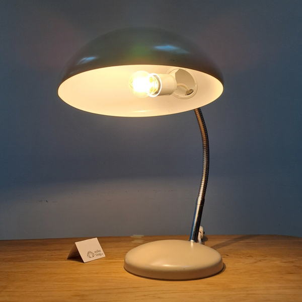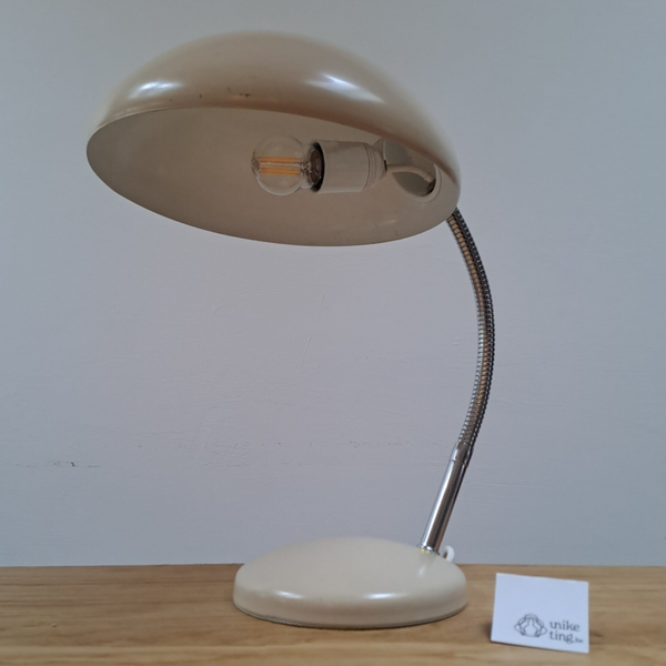 Beschrijving : Elegante bureaulamp uit de jaren 60-70, met typische ganzennek ("gooseneck"), in café latté witte kleur (beige getint, maar niet volledig beige). Met schakelaar aan de draad.