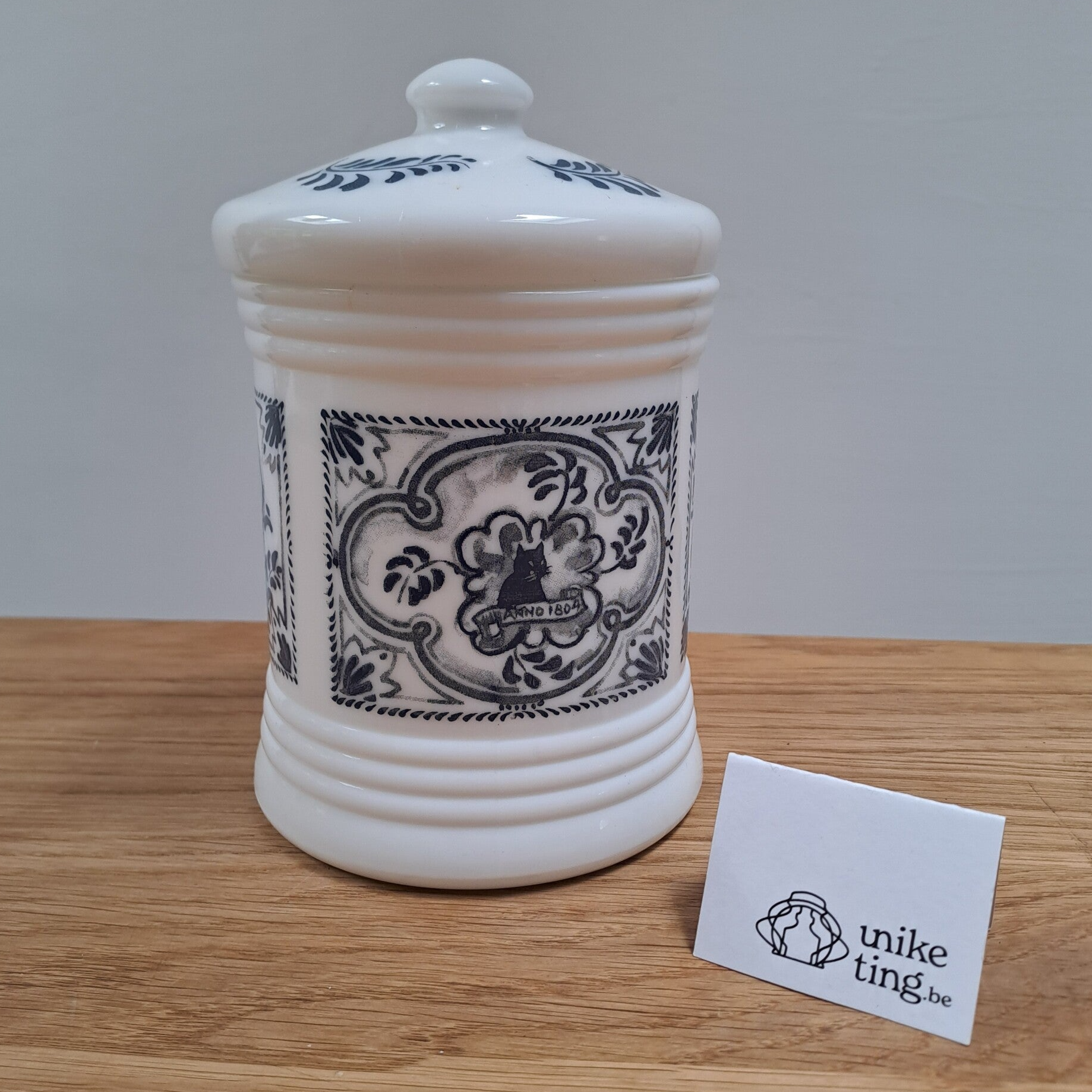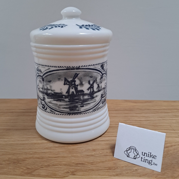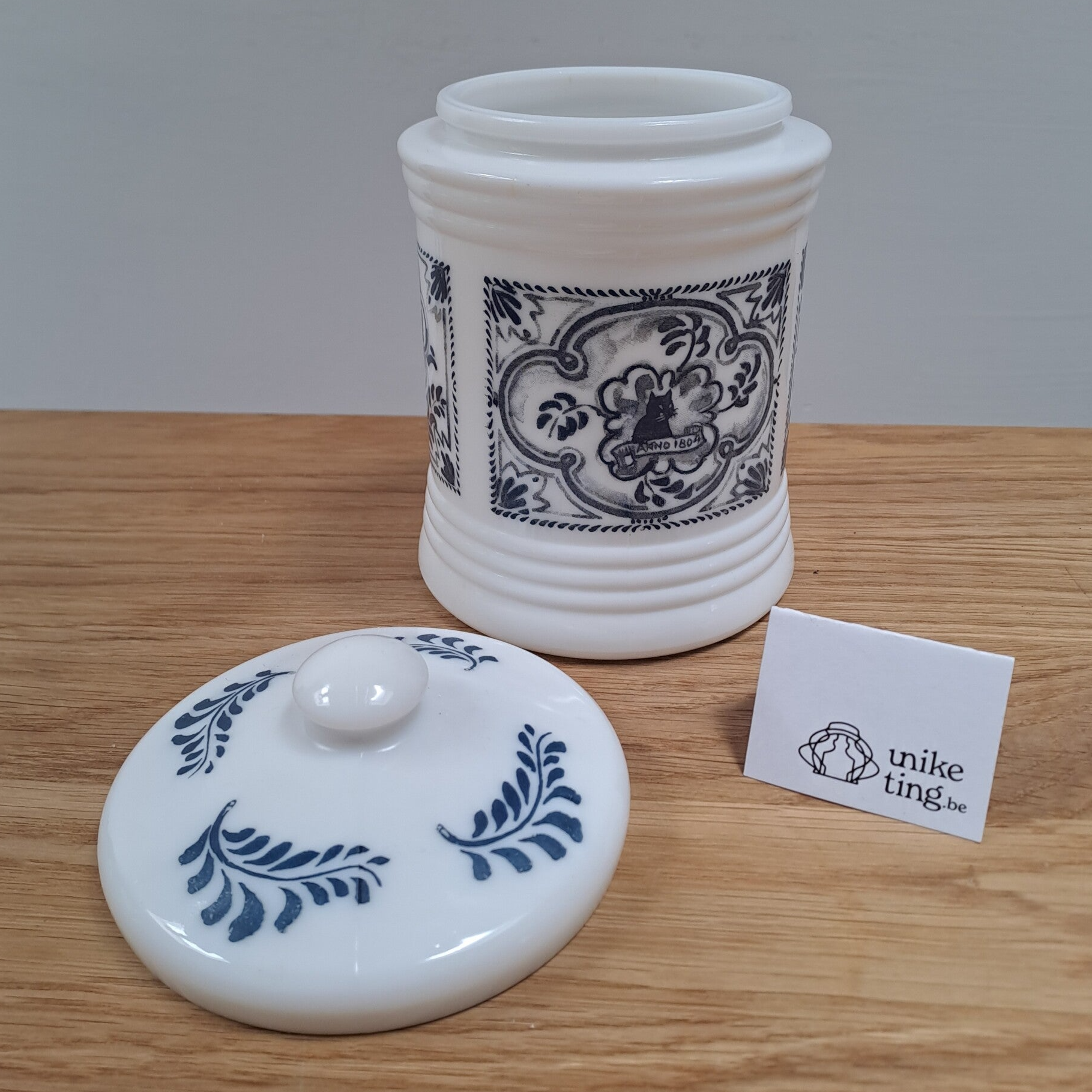 Beschrijving : Opaline voorraadpot van het koffiemerk De Zwarte Kat, wit met donderblauw. Ene zijde toont de een zwarte kat tussen bloemen, andere zijde een windmolen. Gemerkt: "Zuiver koffie-extractpoeder Zwarte Kat (in NL & FR), Netto 250 RCL 339HRL".