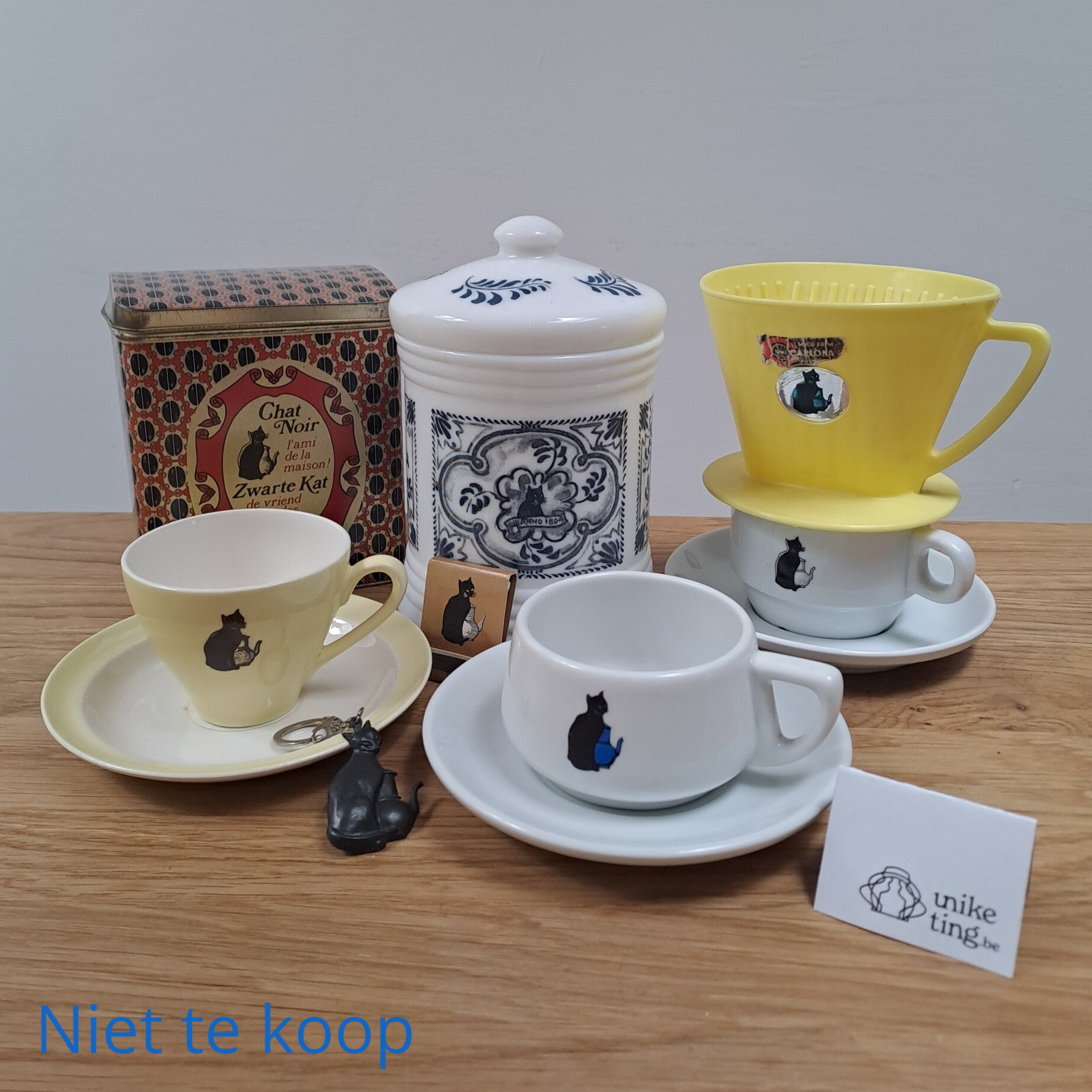 Een beetje historiek?! : De koffiebranderij Zwarte Kat / Chat Noir gaat terug tot het begin van de 19e eeuw - Anno 1804 om meer precies te zijn, tot ze rond 1968 wordt overgenomen door Douwe Egberts. Het logo uit hun meest iconische periode bestaat uit een zwarte kat, naast een dampende koffiepot, een ontwerp van de Franse kunstenaar Cassandre. Toen was hun leuze "Zwarte kat, de vriend des huizes". Deze opaline voorraadpot was een beetje een parodie op Delfts aardewerk.