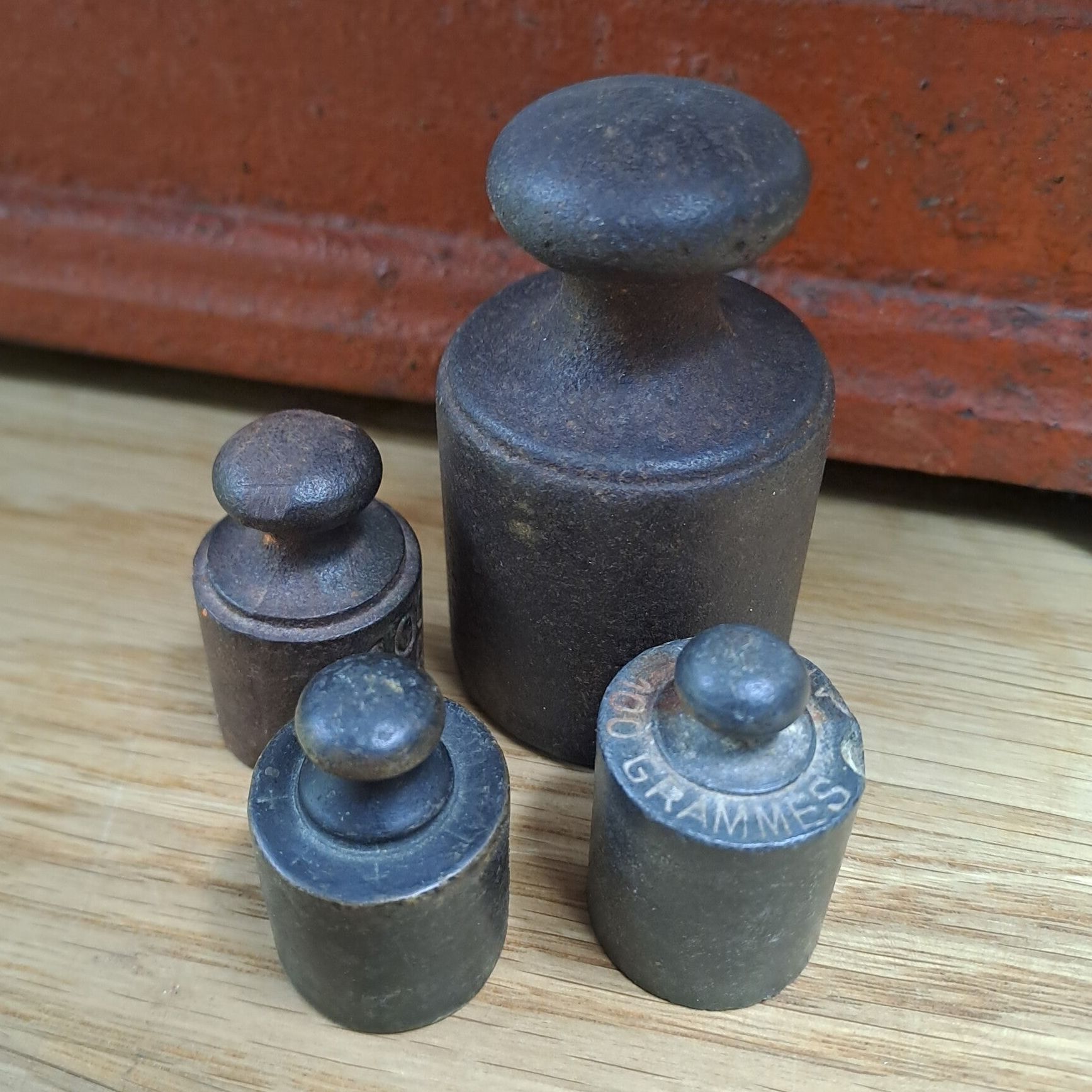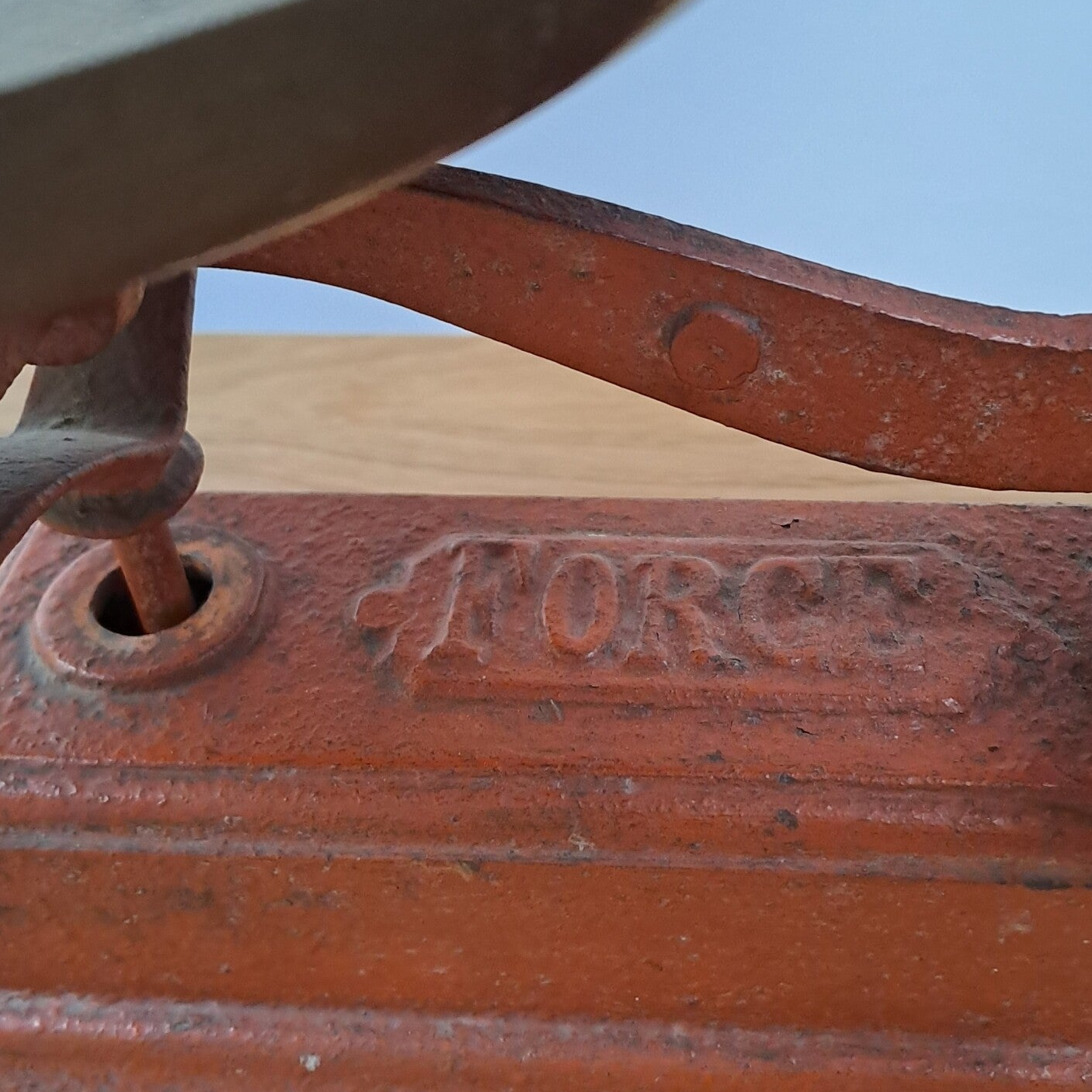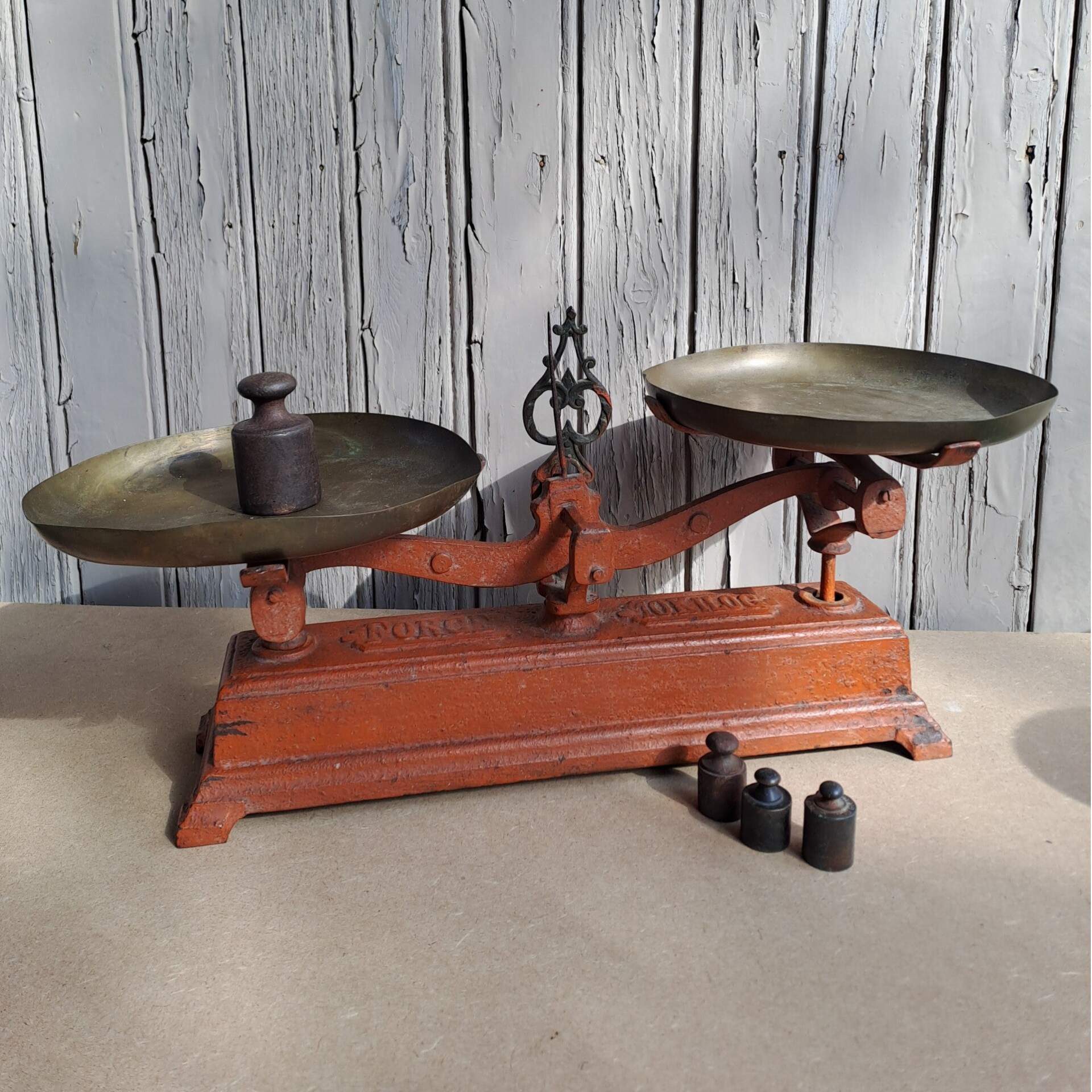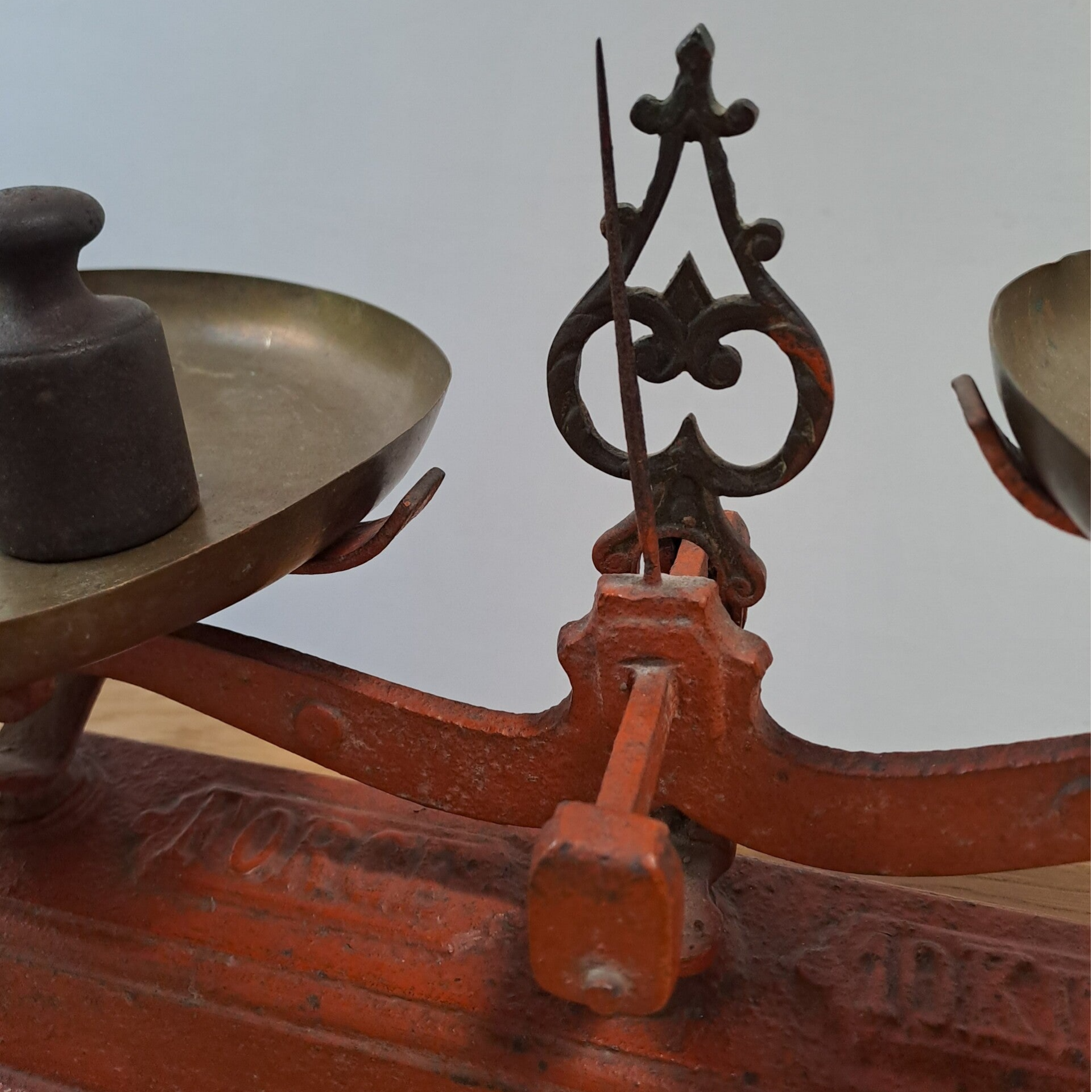 Beschrijving : Antieke gietijzeren weegschaal, in oranje-rood, met 2 schalen en enkele gewichten. Gemerkt "Force" & "10Kilog".