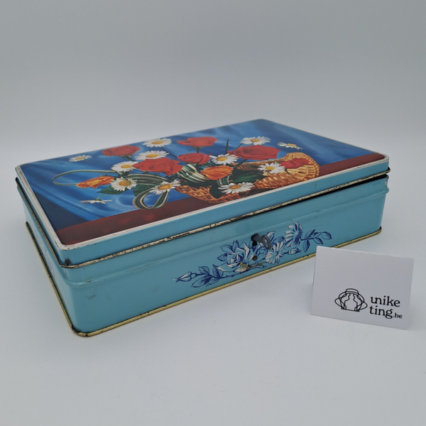 - Blauwe met kleurrijk boeket: gemerkt "Superchocolat Jacques" - mét sleuteltje (ongeveer 25,5 x 17 x 5).