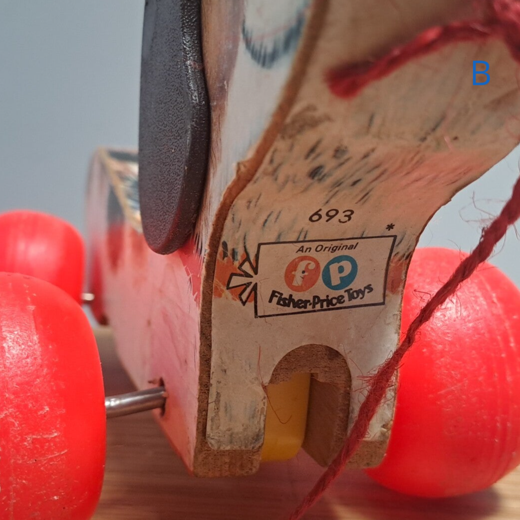 Versie B (zonder schoentje): Gemerkt Vooraan: "693 An Original Fisher Price Toy" / Achteraan verdwenen.