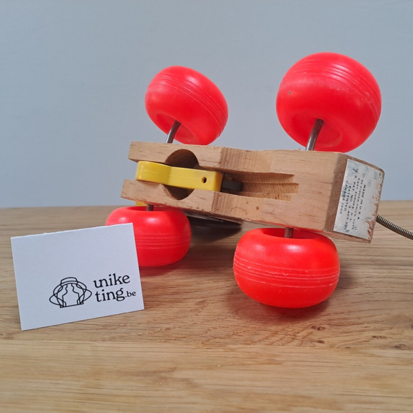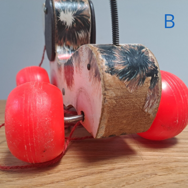 Versie B (zonder schoentje-foto 8 tot 12): Degelijke vintage staat, maar met meer gebruikssporen, o.a. aan de wielen, het wit wat meer verkleurd, hier en daar wat meer van hout zichtbaar en opdruk aan de achterzijde is afgesleten. Geen geel schoentje meer, en koordje vervangen.