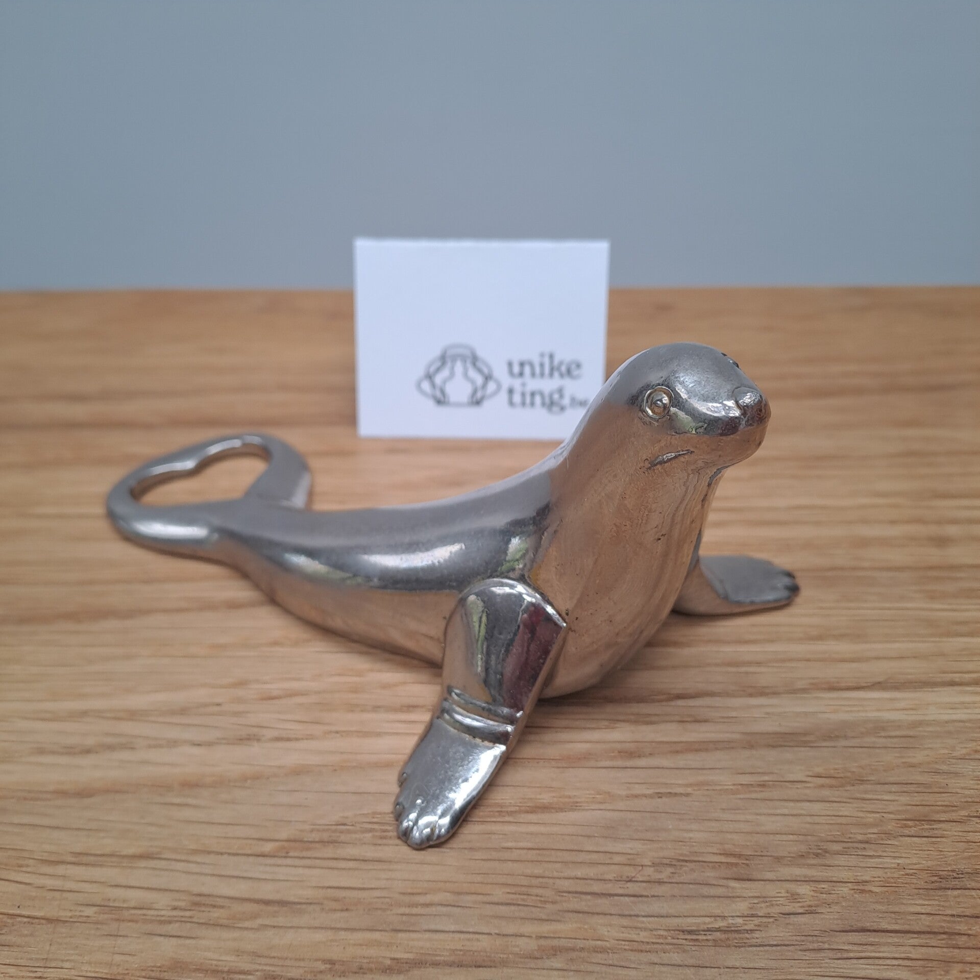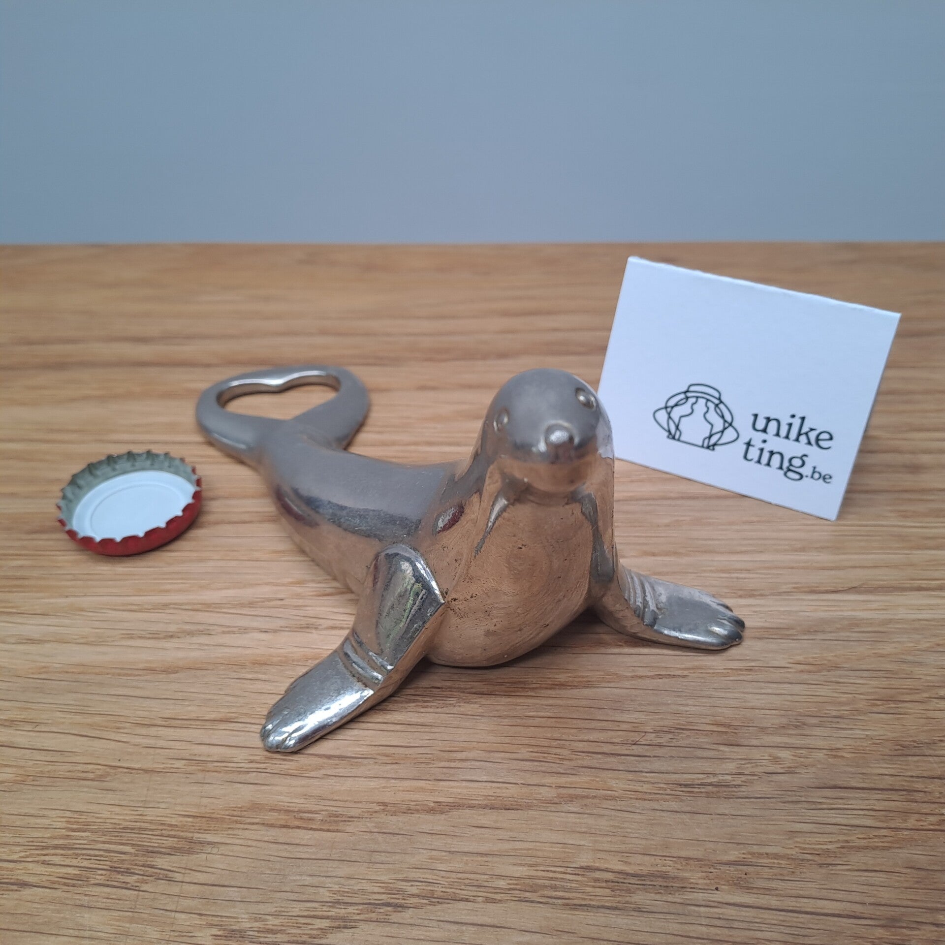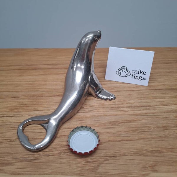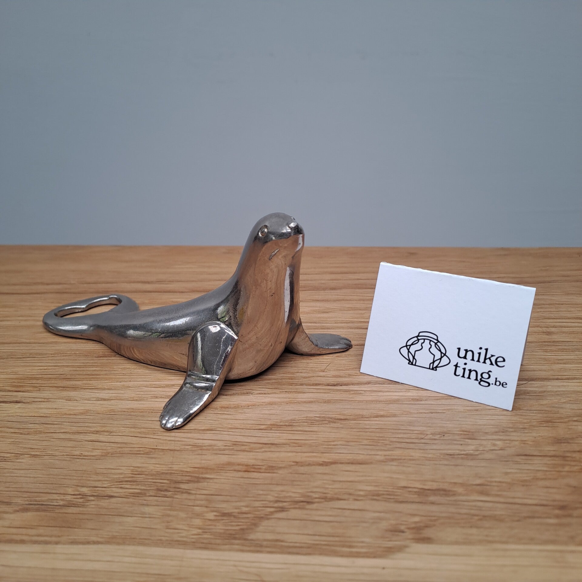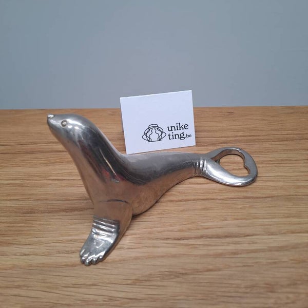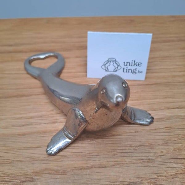 Beschrijving : Metalen kurkentrekker in de vorm van een zeehond. Binnenin gemerkt "BMF N Made in W.-Germany".