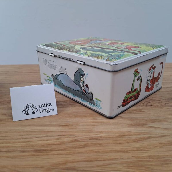 Doos B: Blikken doos van Rombouts koffie, uit de jaren '60. Met tafereel en figuren uit The Jungle Book, o.a. King Louie, Kaa, Shere Khan,...