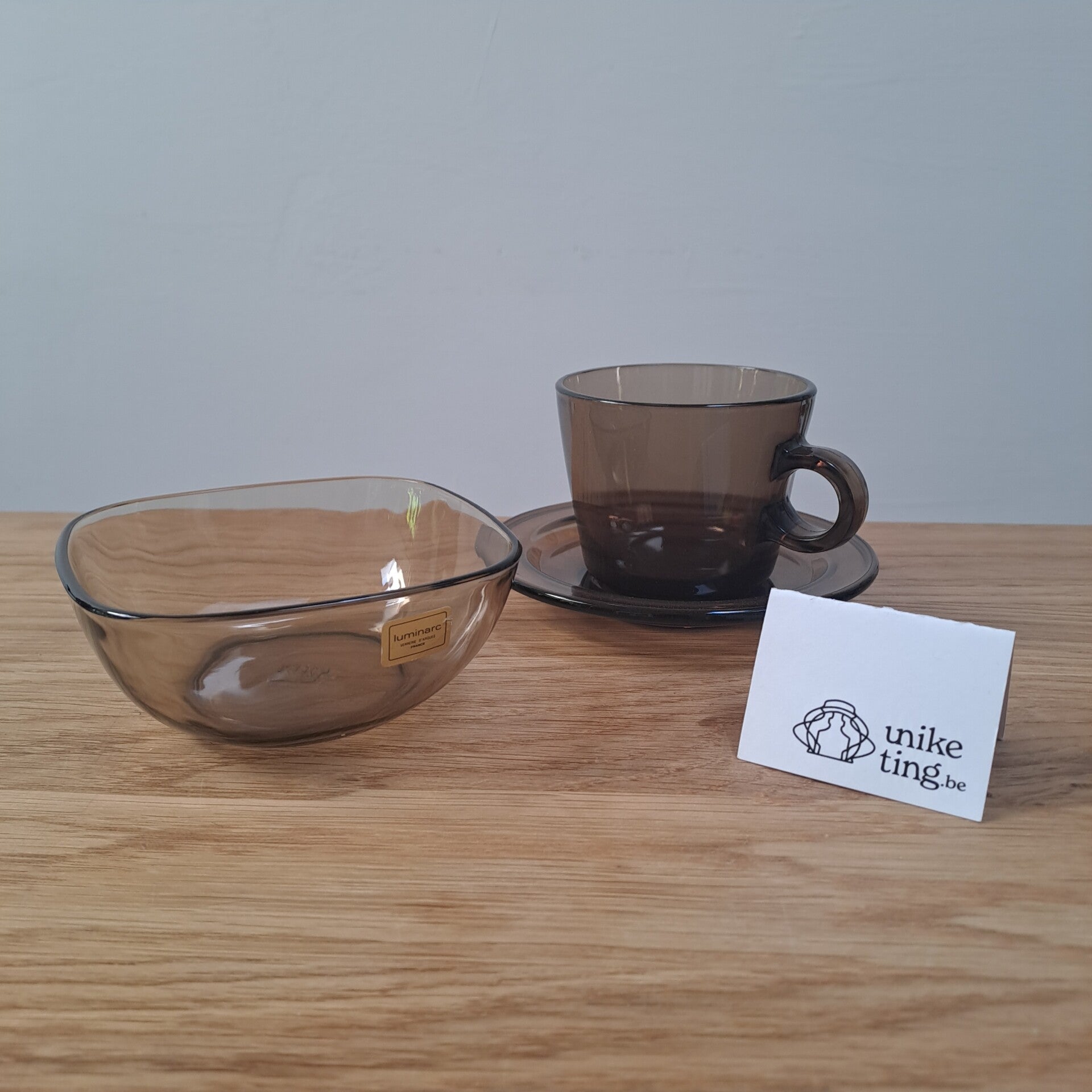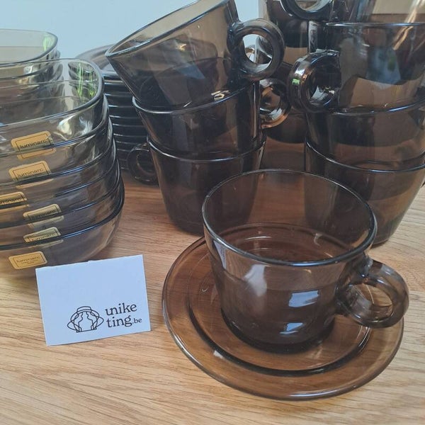 Beschrijving : Bruin rookglazen servies, bestaande uit 12 x een koffietas met ondertas en kommetje (36 stuks in totaal). Onderaan zijn ze gemerkt met "Seca", op de kommertjes staat een sticker "luminarc verrerie d'arques France".