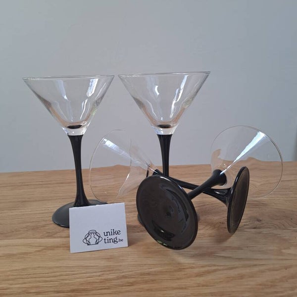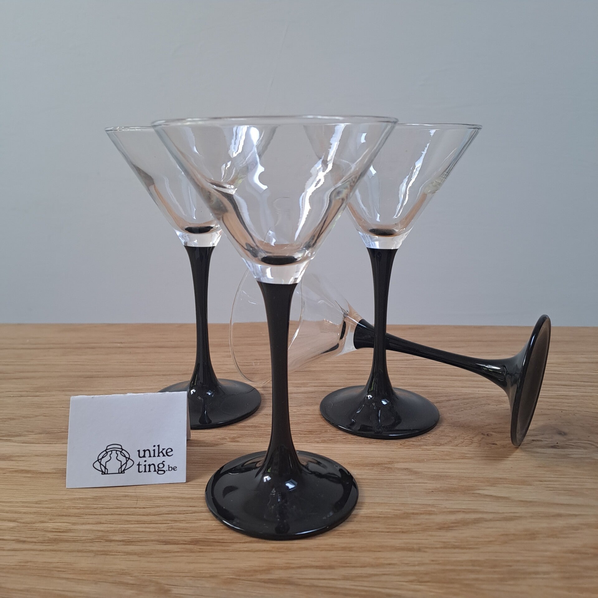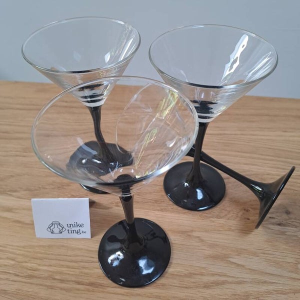 Beschrijving : Supercoole, James Bond-achtige, martini of cocktail glazen, met een zwarte voet, onderaan gemerkt "Luminarc, France".