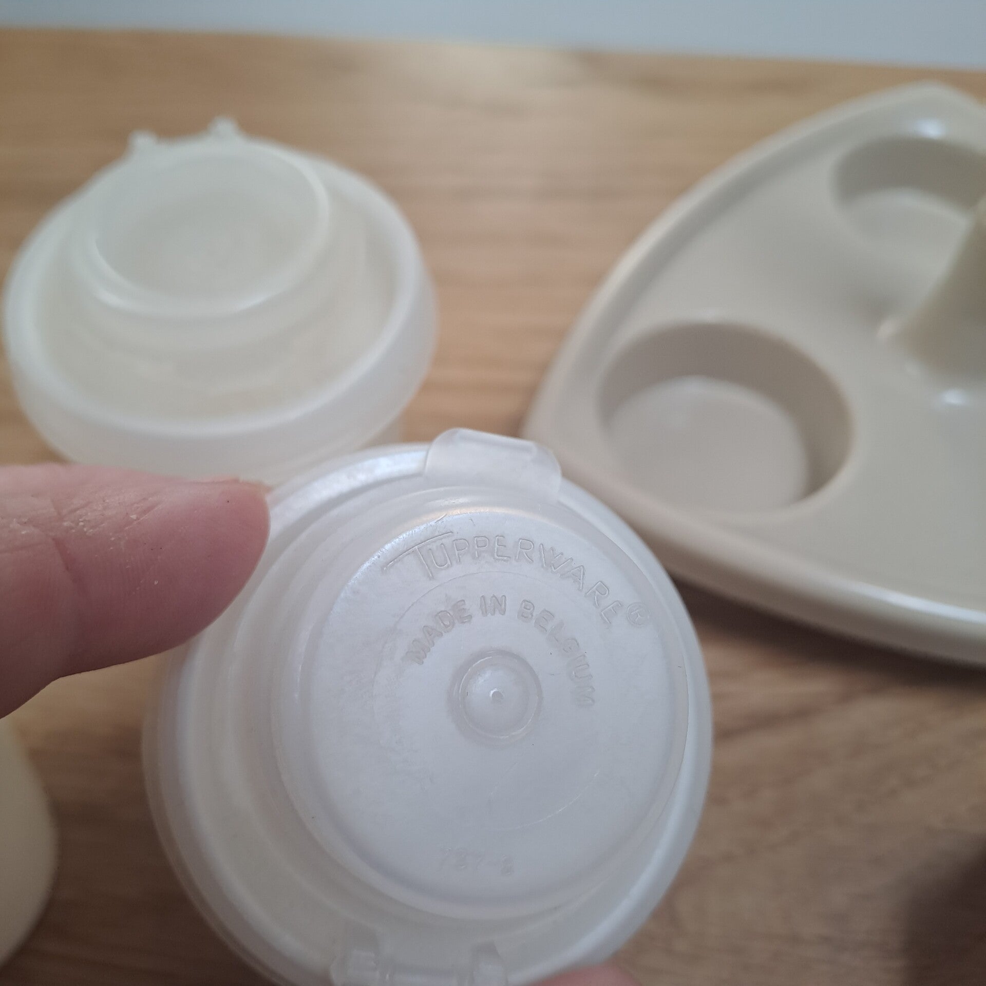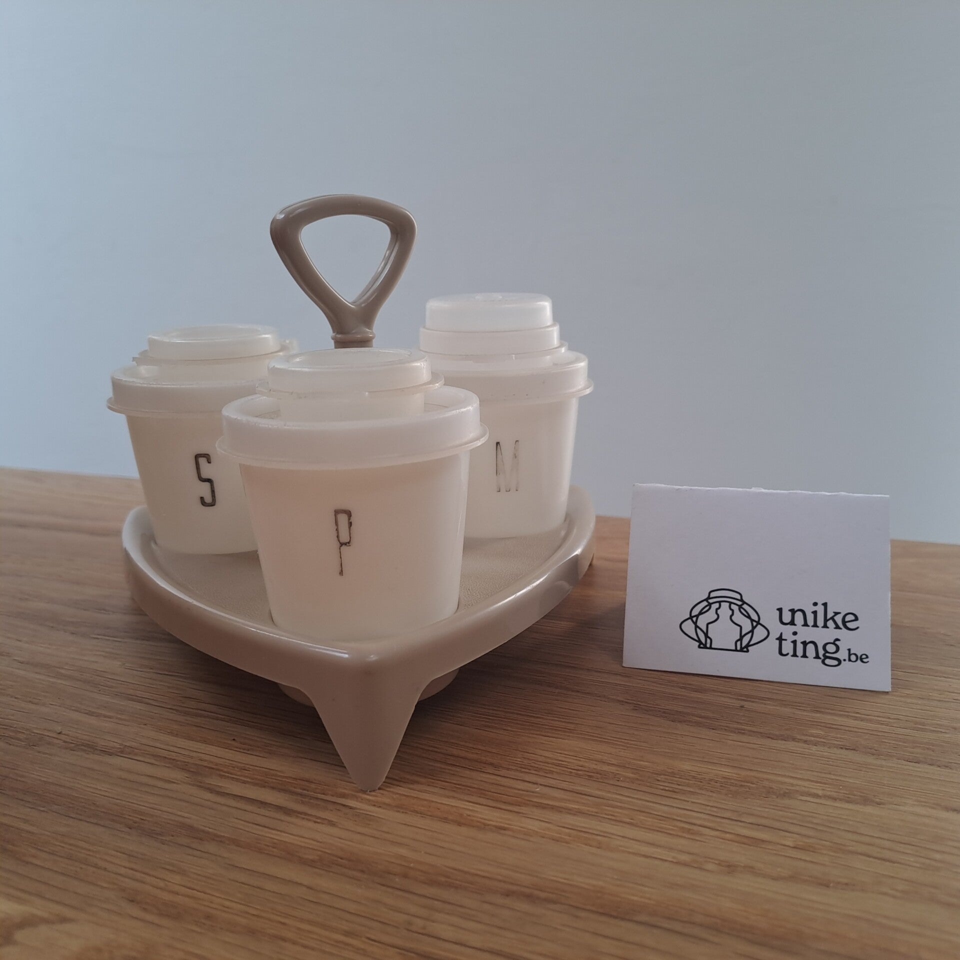 Beschrijving : Een tafelsetje van zout, peper en mosterd op een standaardje. Gemerkt "Tupperware, Orlando, Florida, USA" & "Tupperware, made in Belgium"