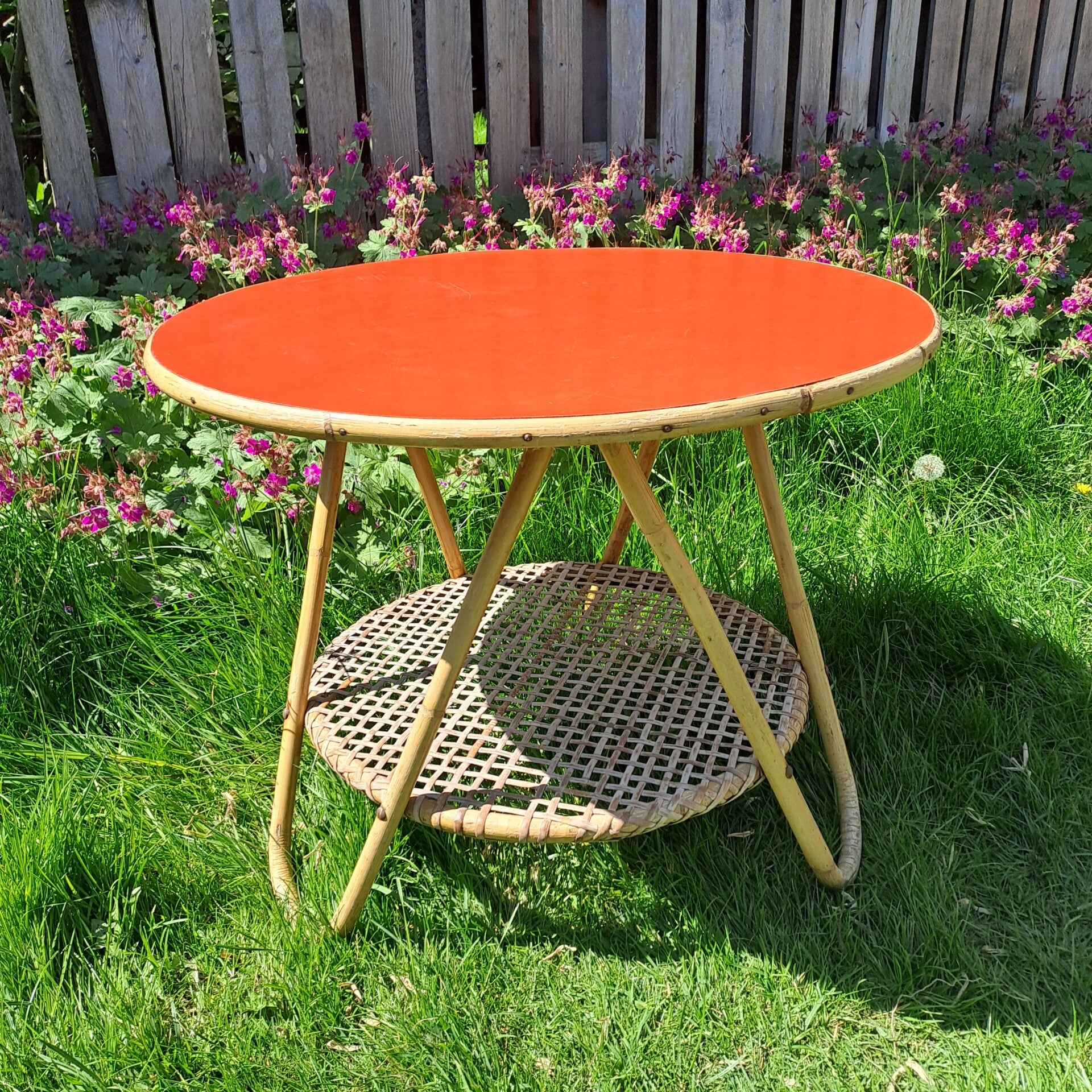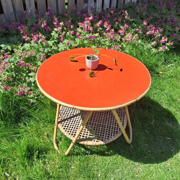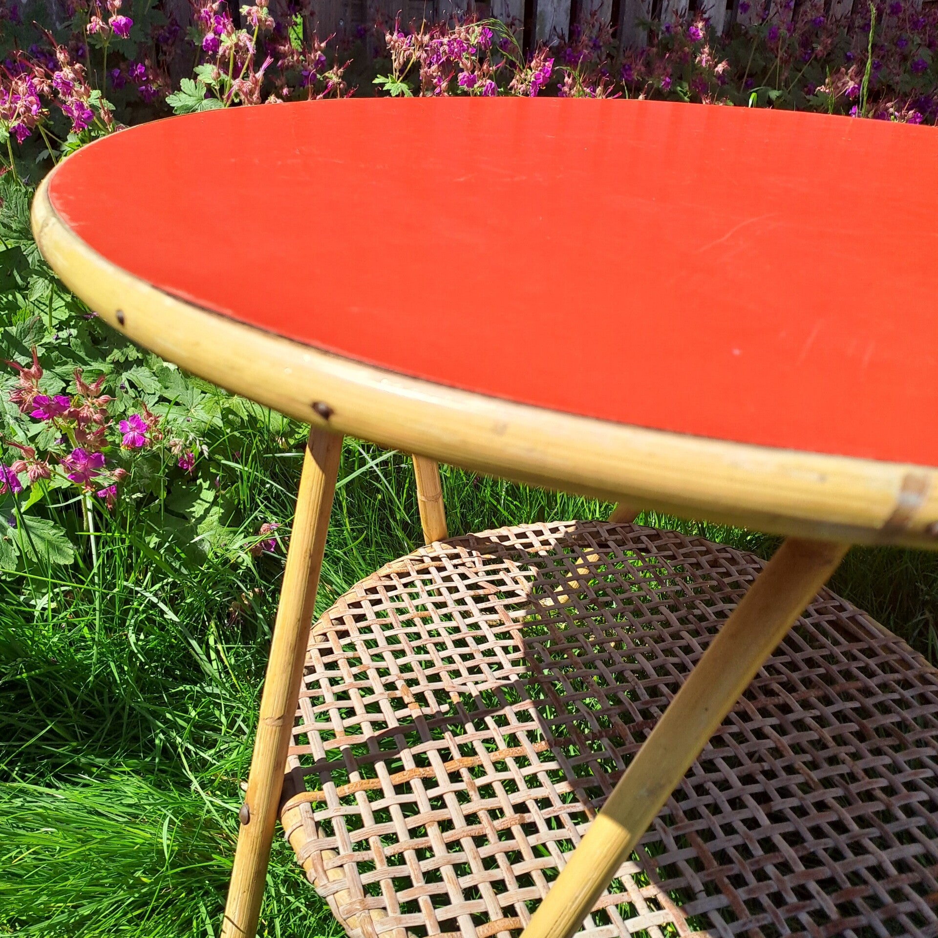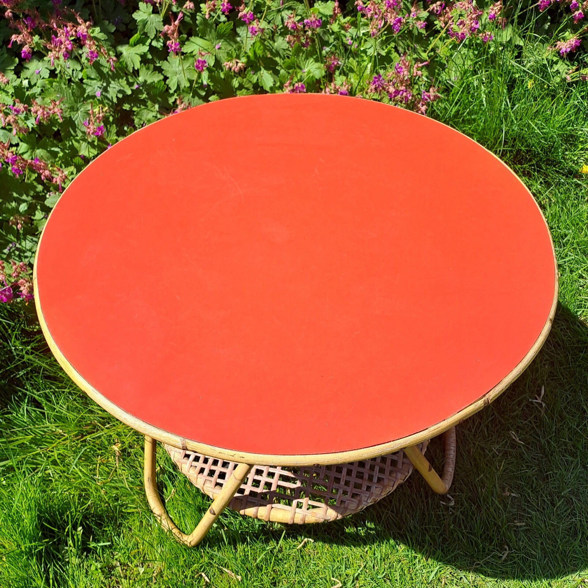 Beschrijving : Een salon- of bijzettafeltje in rotan, met een rood vlak.