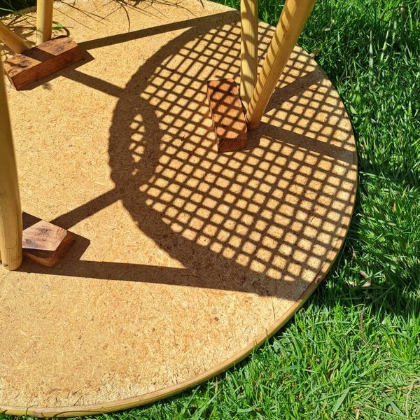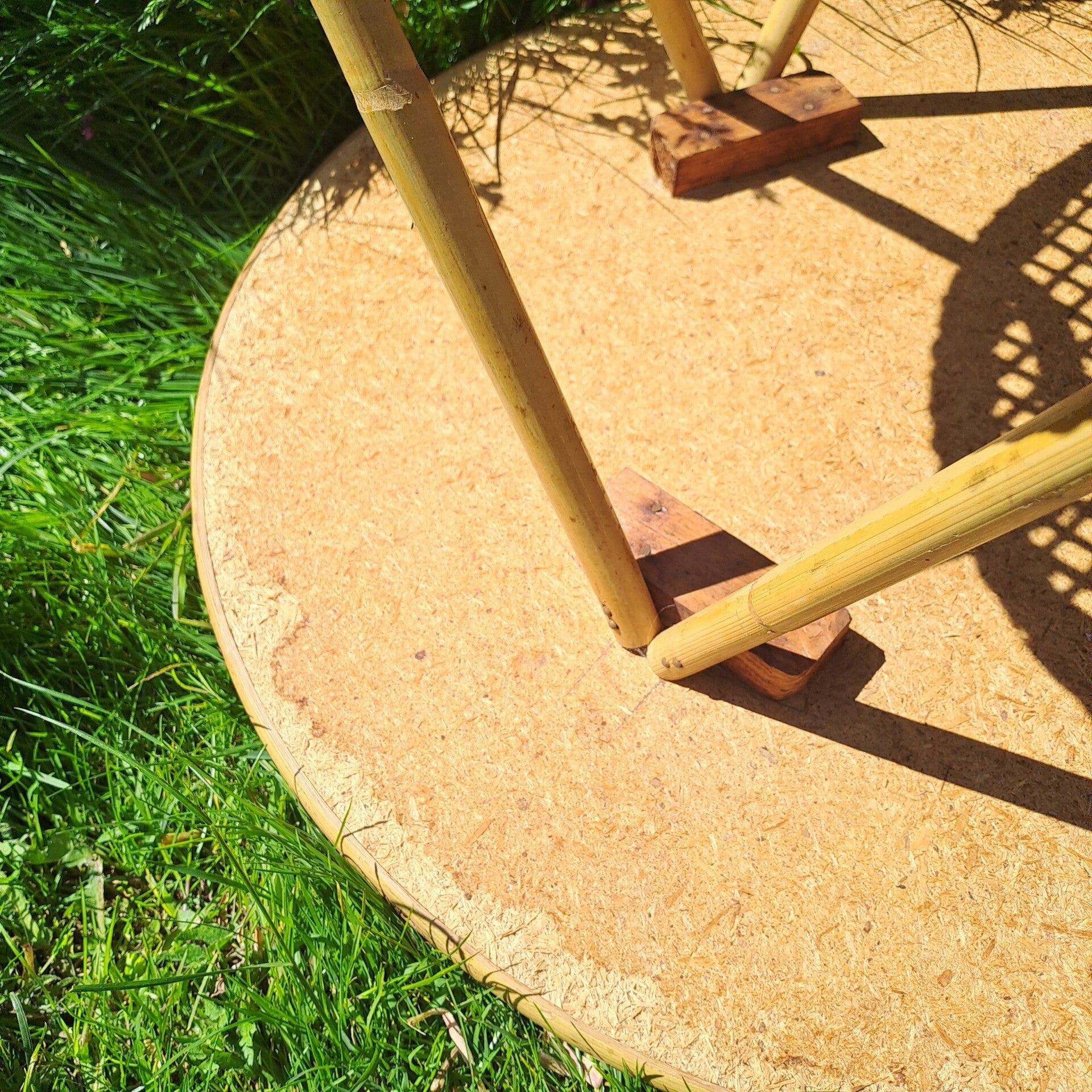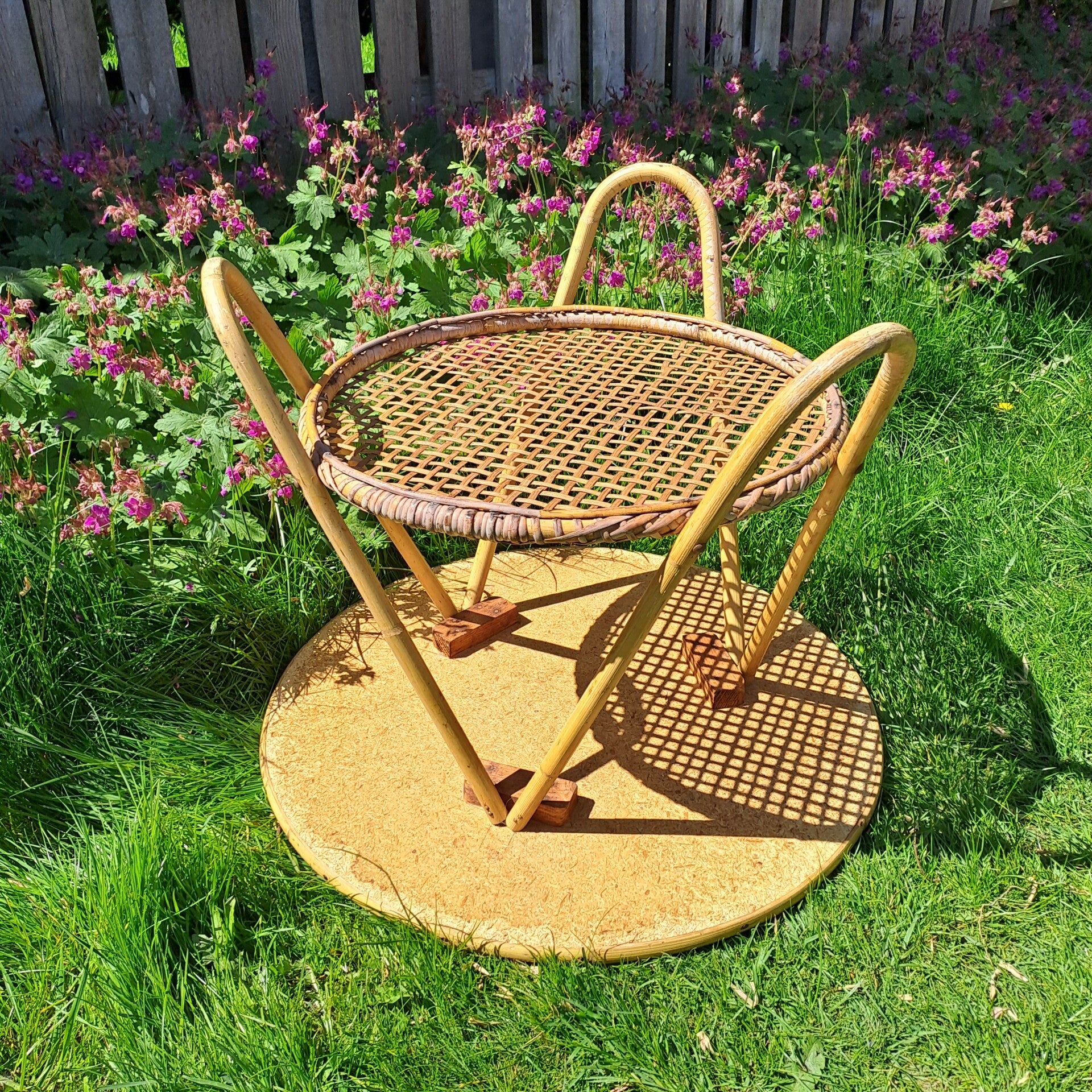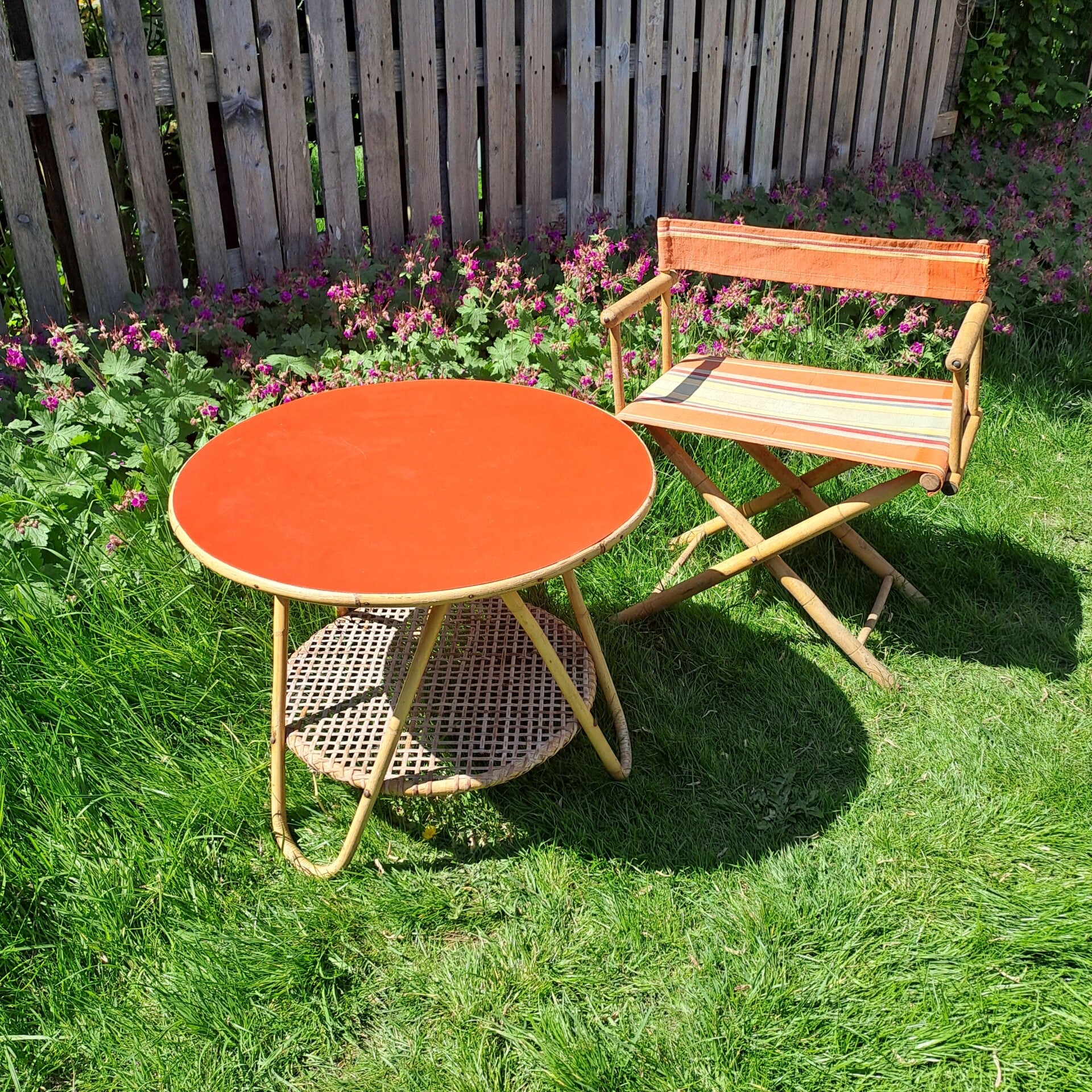 Beschrijving : Een salon- of bijzettafeltje in rotan, met een rood vlak.