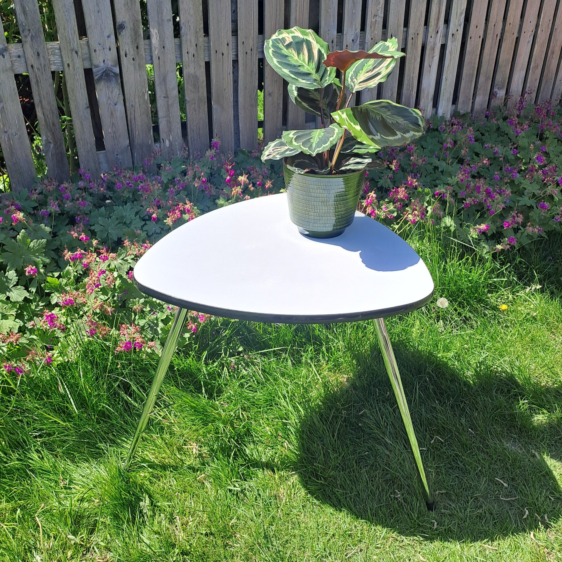 Beschrijving : Uniek salon- of bijzettafeltje met lichtblauw-grijs formica oppervlak.