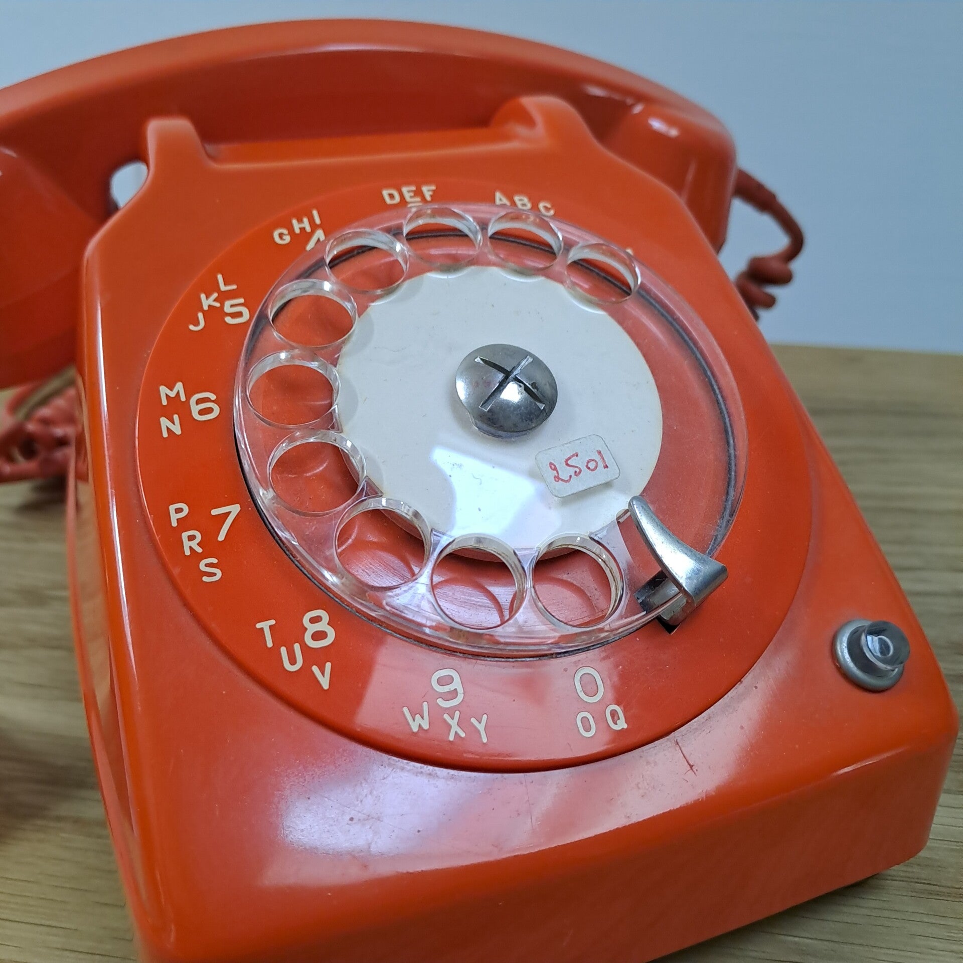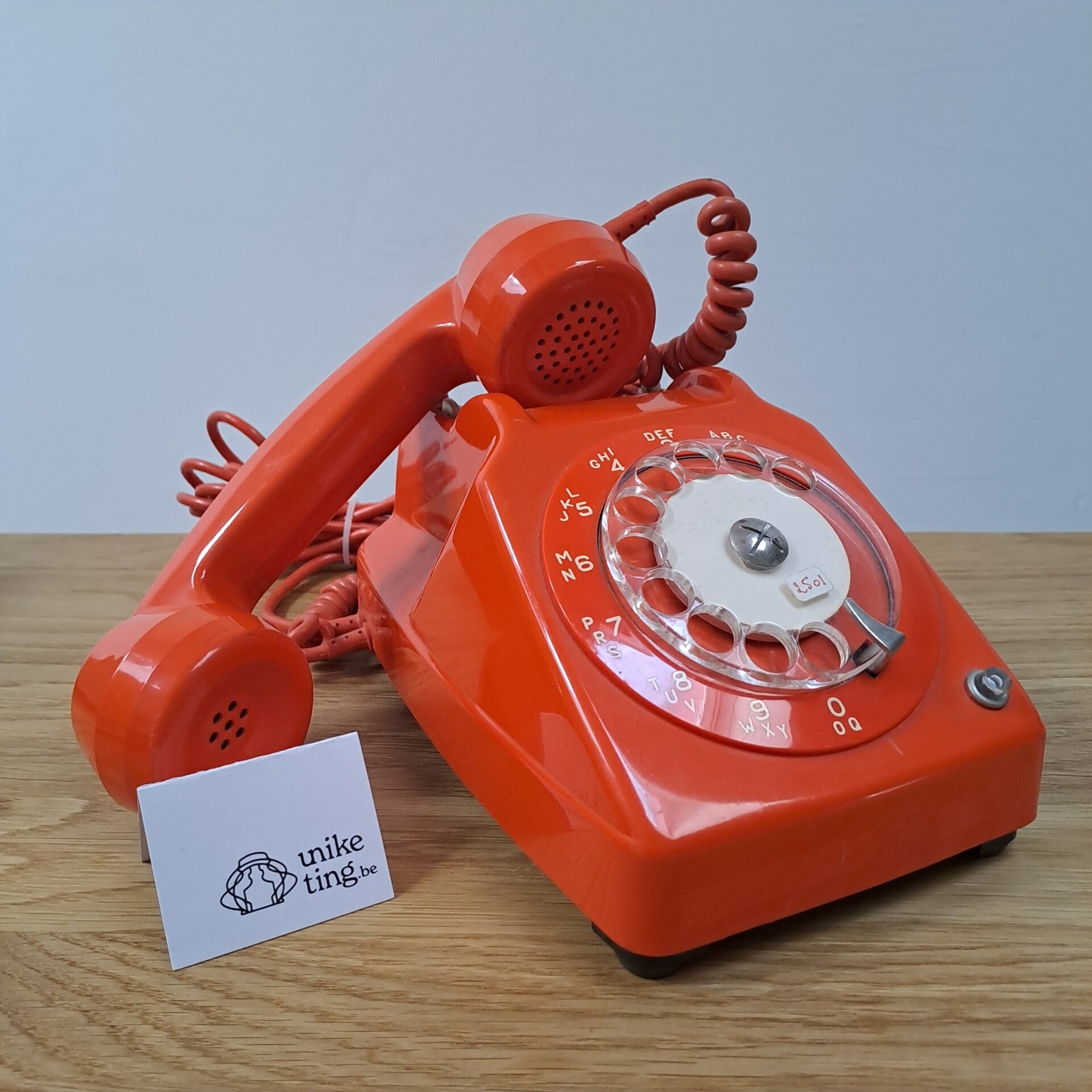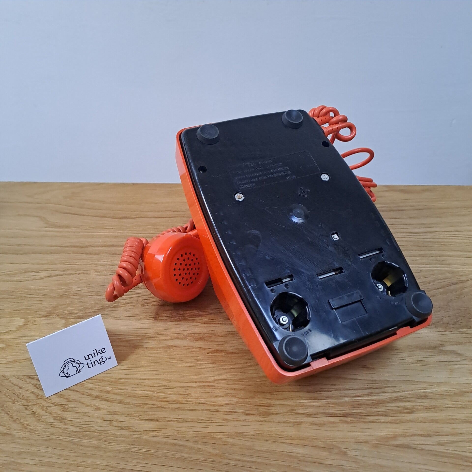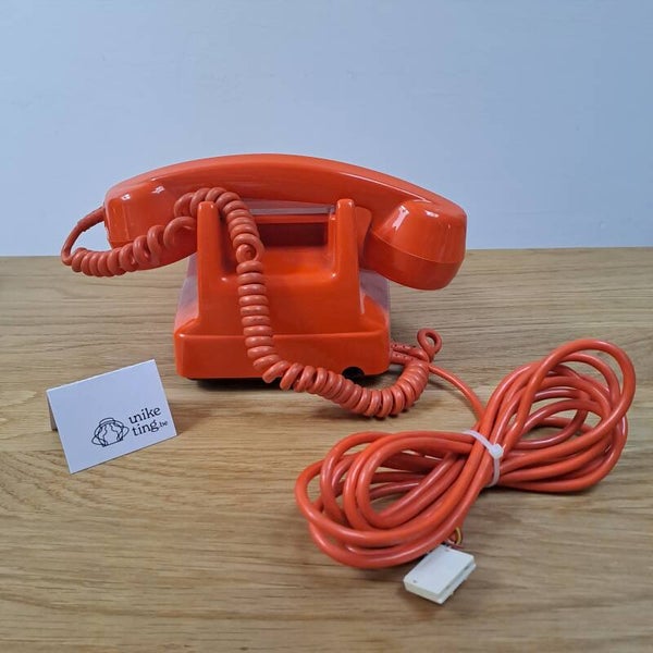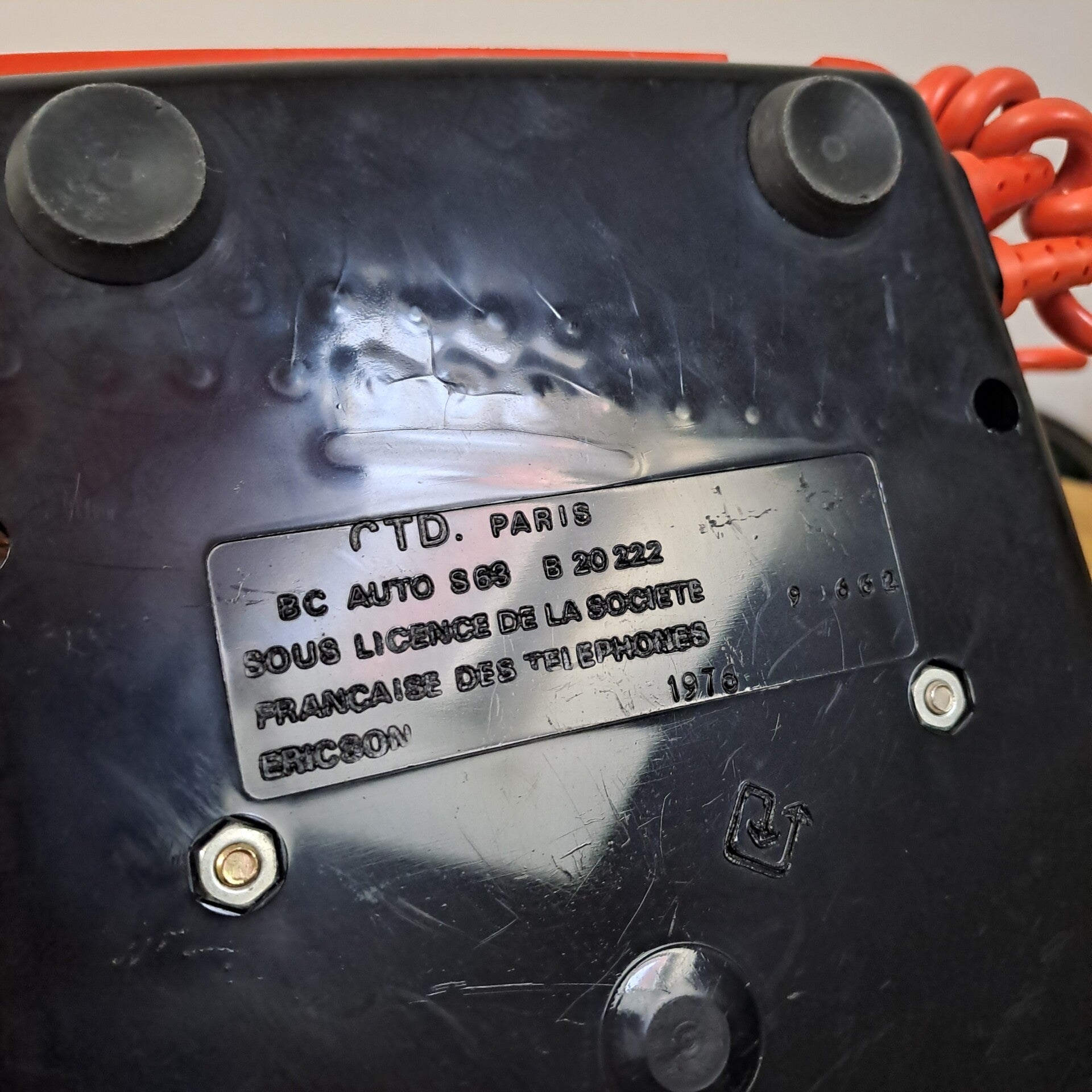Beschrijving : Coole oranje draaitelefoon, onderaan gemerkt "TD PARIS Bc auto S63 B20222, sous licence de la societe francaise des telephones ericson 1976".