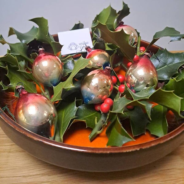 Een beetje historiek?! : Als ik chat GPT mag geloven (ja, soms zijn we ook modern, maar meestal vintage ;) ) gaan glazen kerstballen terug tot de 16e eeuw in Duitsland. Deze zijn uiteraard niet zo oud, maar komen toch uit een tijd dat ze nog niet in grote massa werden geproduceerd, en dus echte ambachtskunstwerkjes zijn. Zelf met maar een paar van deze in je kerstboom krijgt ie alvast wat meer cachet. Of zet de blikken doos met wat lichtjes op je tafel, en je interieur schittert...