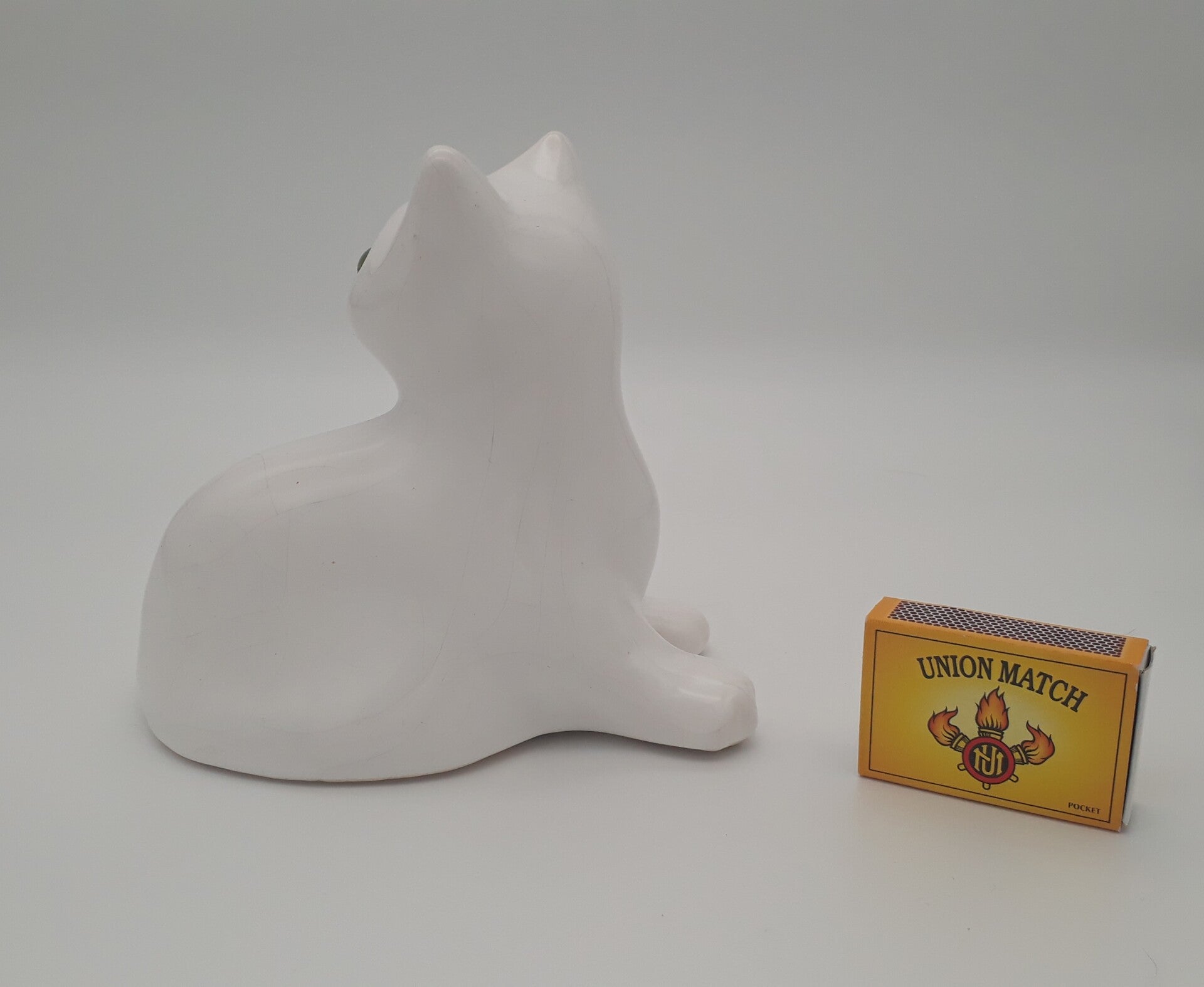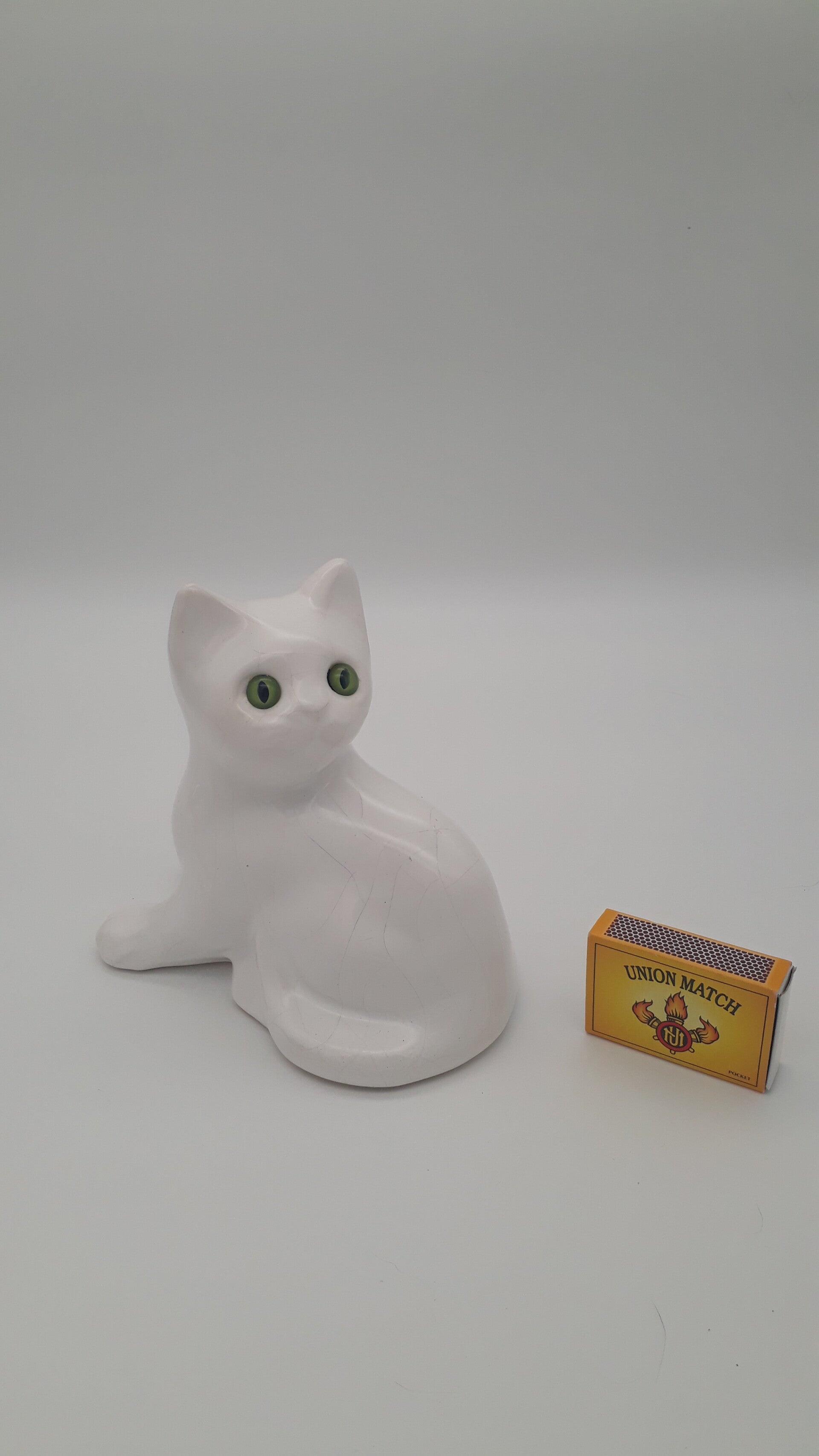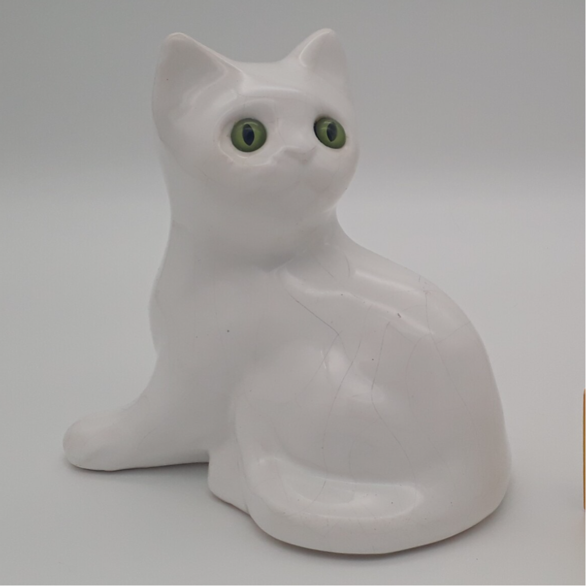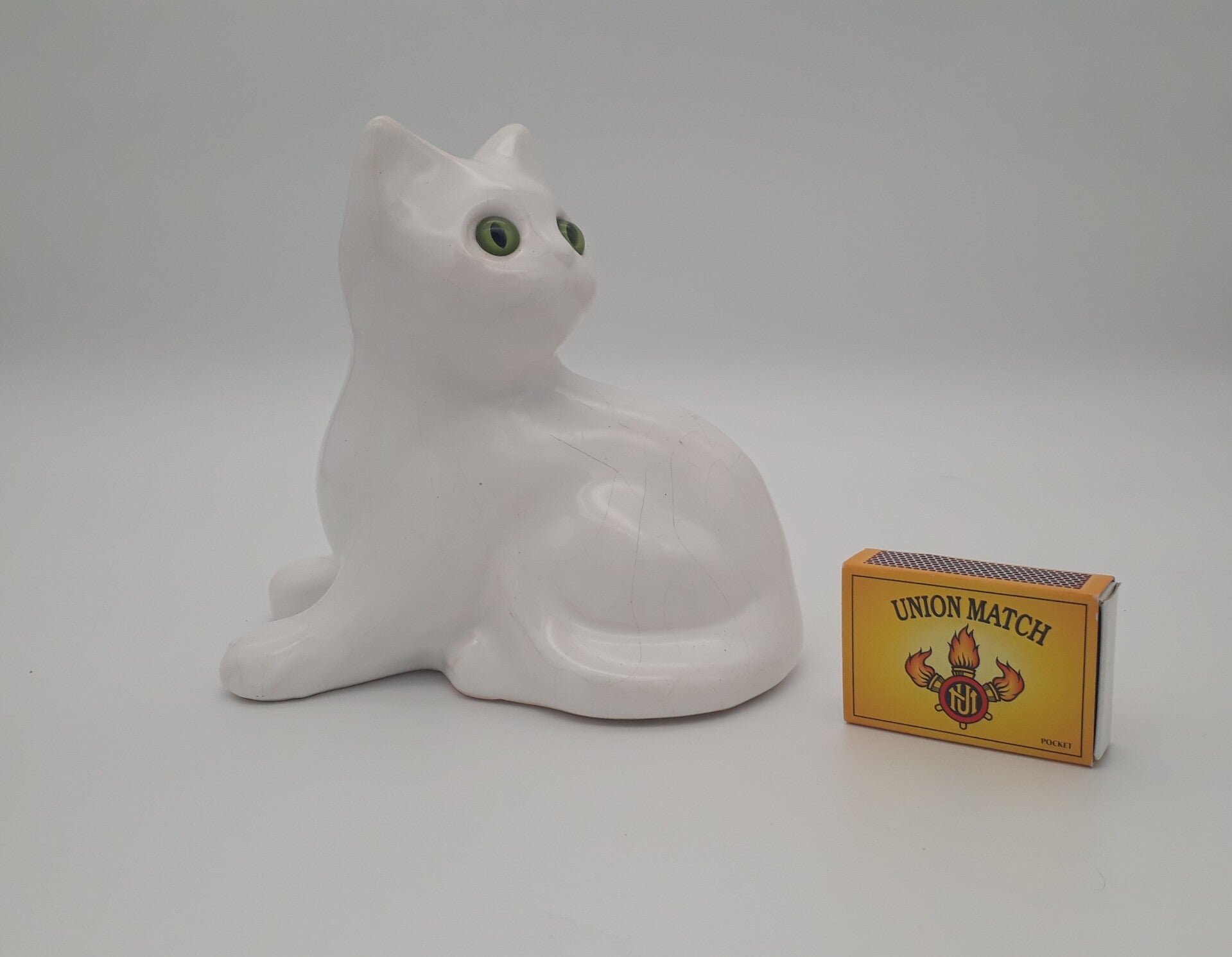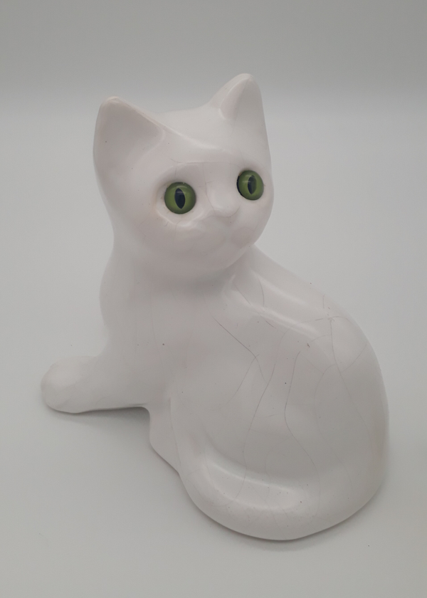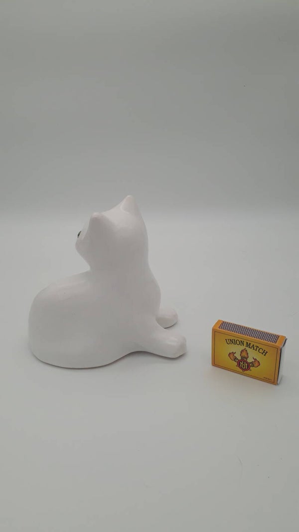 Beschrijving : Beeldje van witte kat met groene ogen. Hol binnenin. Heerlijke kitch, een eye-catcher in elk interieur !
