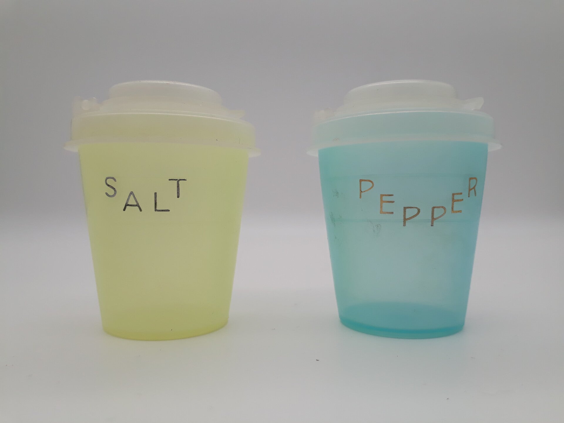 Beschrijving : Set Pepper & Salt, geel en blauw, goud en zilver letters
