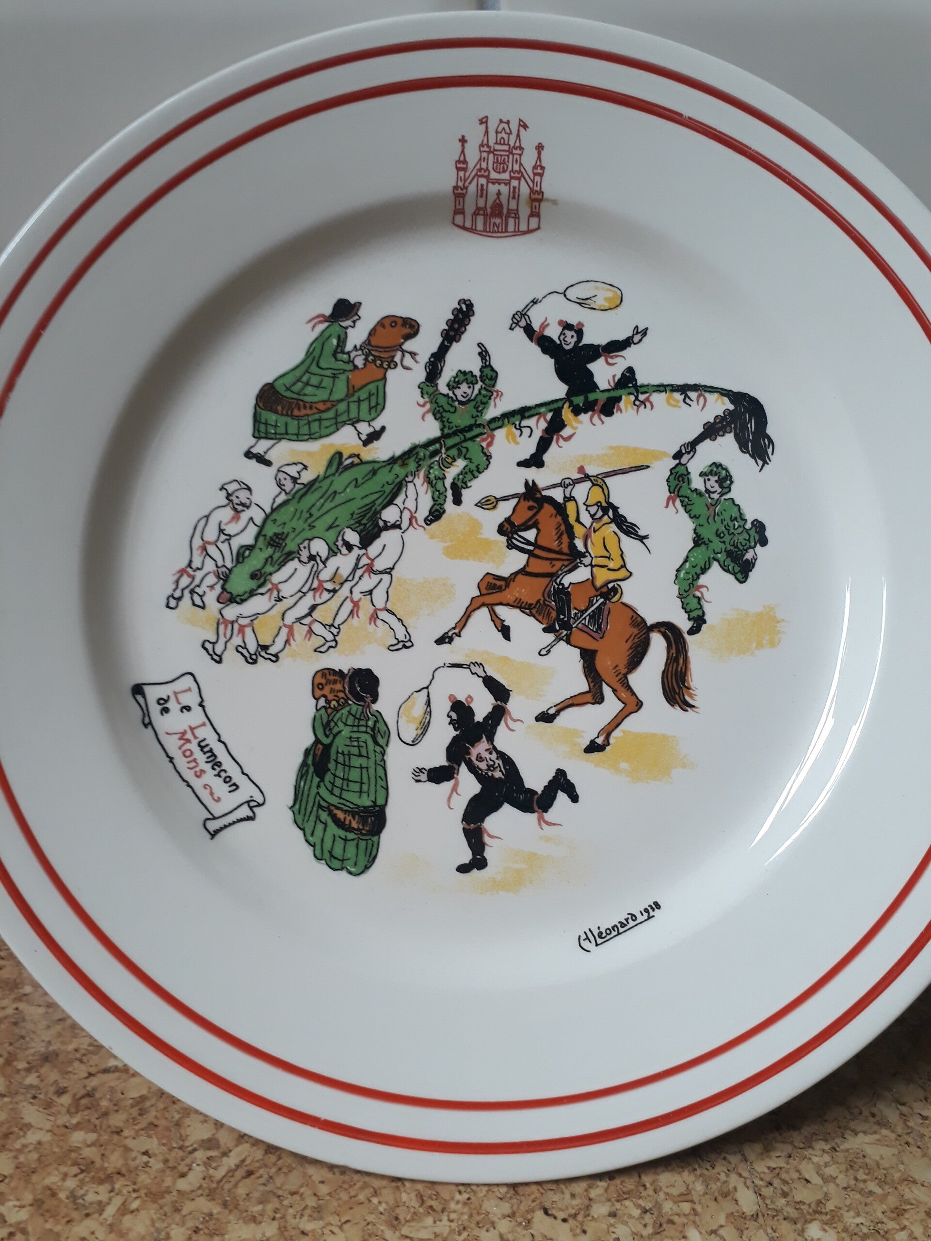 Beschrijving : Decoratief bord, met geschilderd motief van "Le Lumeçon de Mons". Gemaakt in de Belgische kermaiek-fabriek Boch Frères. Gesigneerd door de kunstenaar A.Léonard + jaartal 1938. Onderdeel van het atelier "Maison Jean Lescartes".