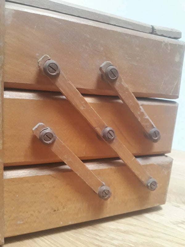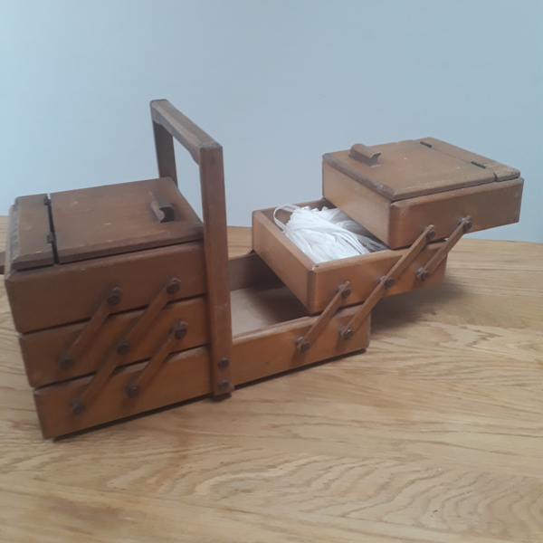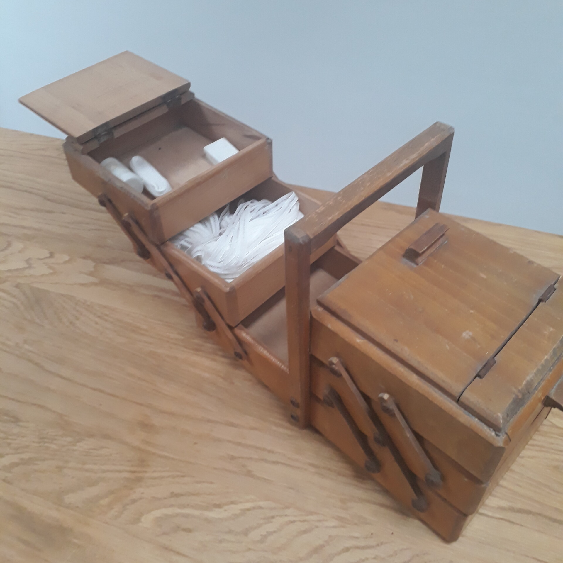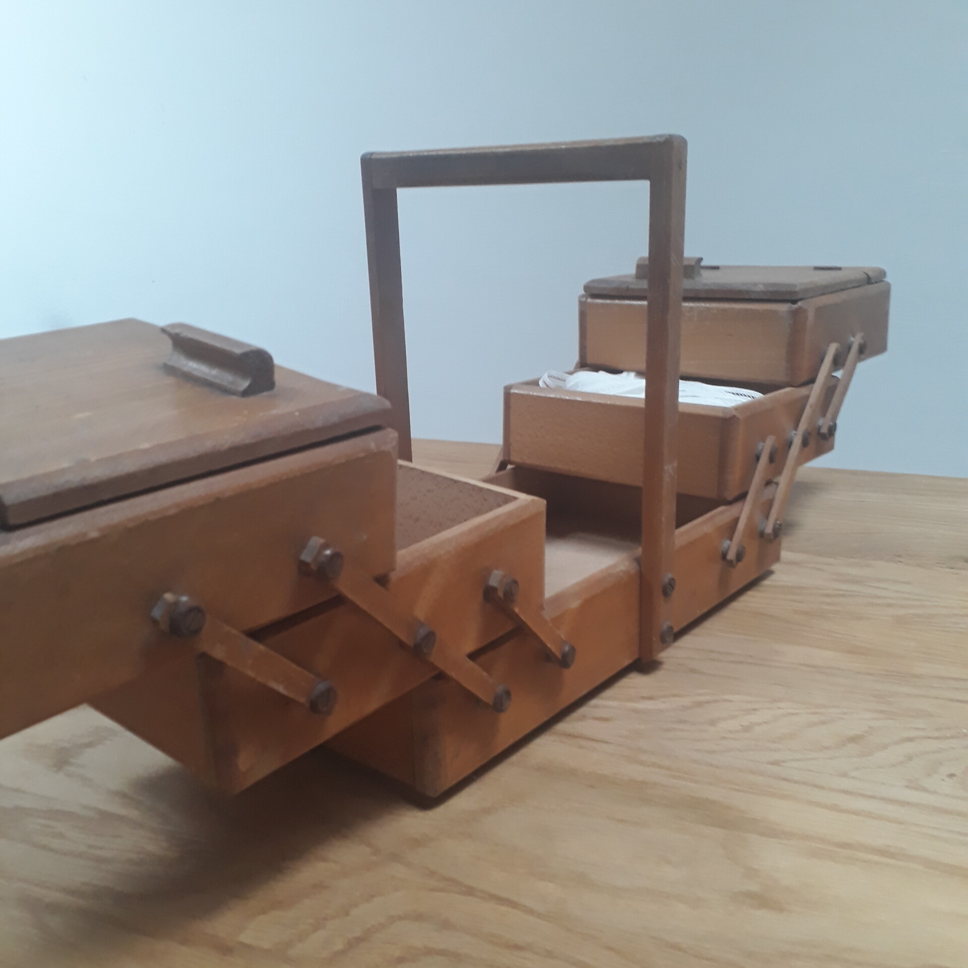 Beschrijving : Naaikistje, met uitklapbare deelvakjes