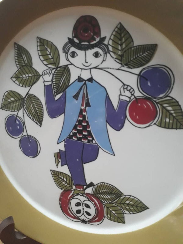 Beschrijving : Decoratief bordje: mannetje met fruit (groen, paars, beide, rood). Label: "Turi Design Corsica, Made in FF (Figgjo Flint) Norway, handpainted silkscreen"