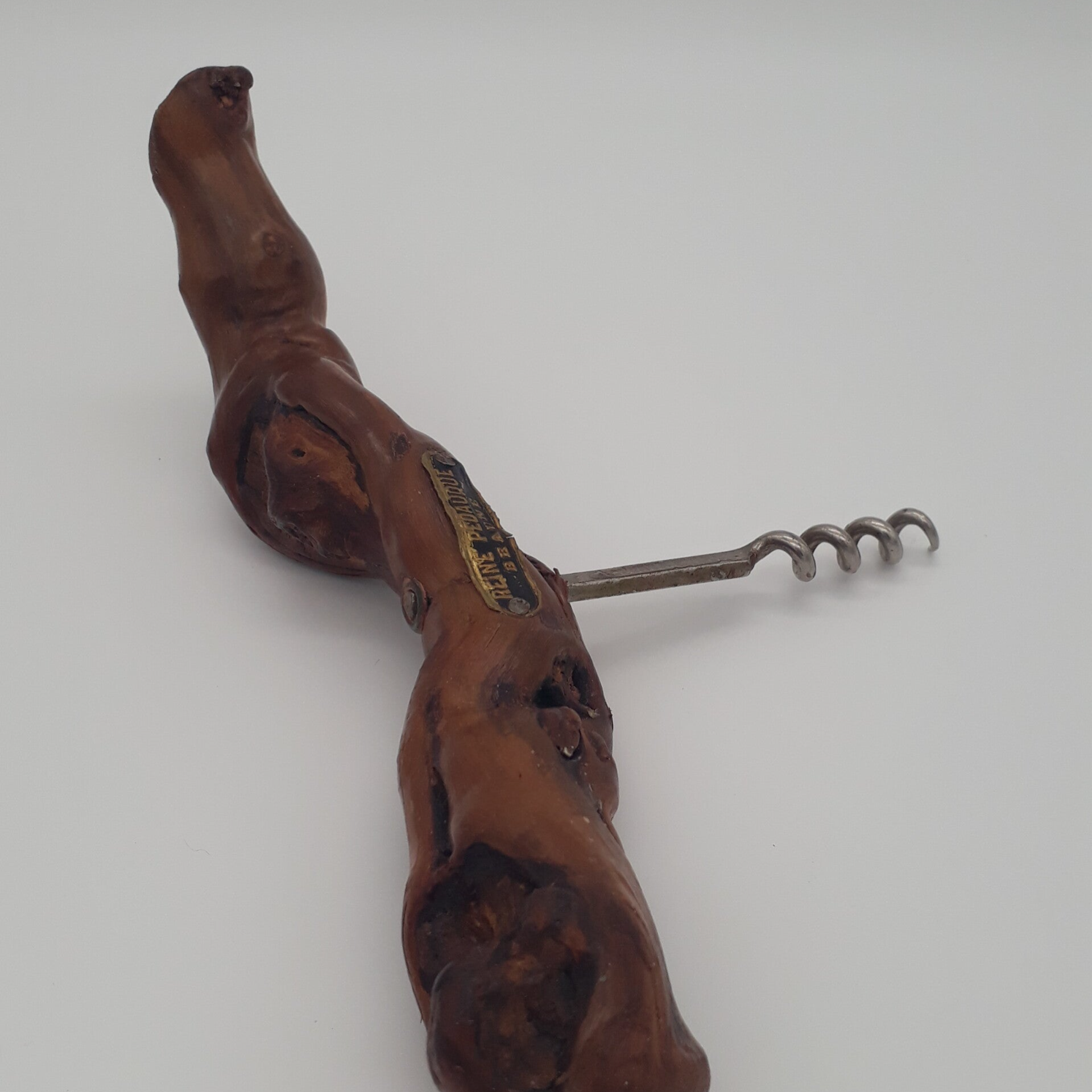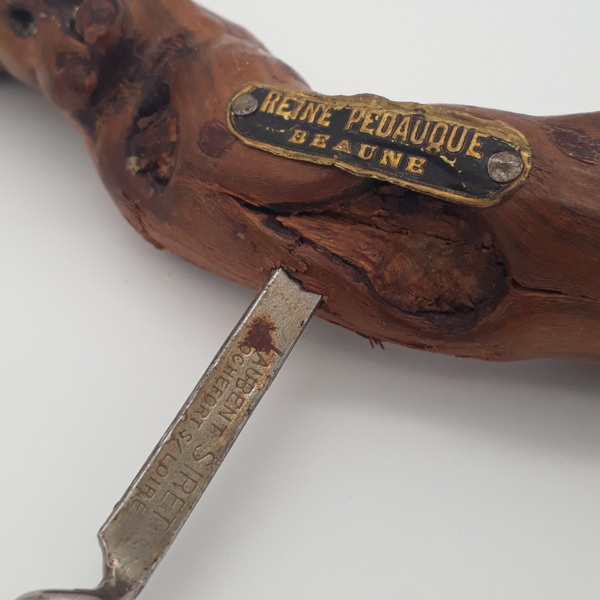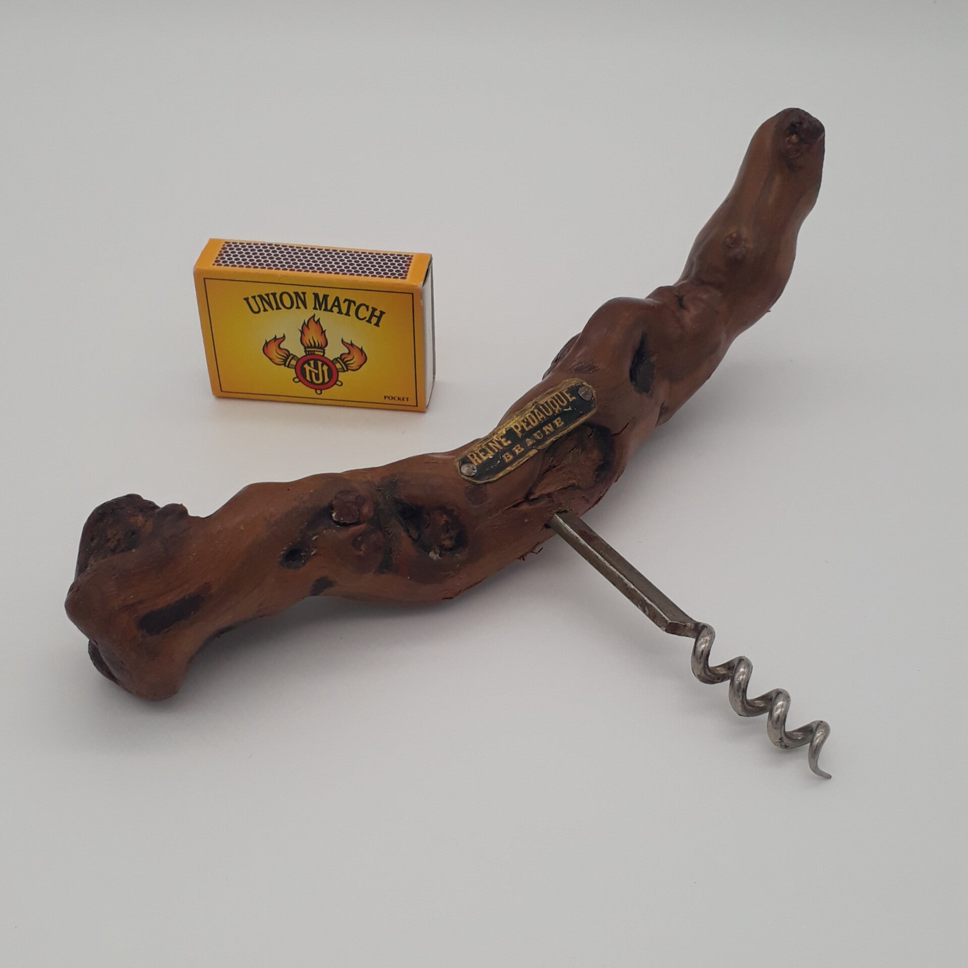 Beschrijving : Kurkentrekker, met houten handvat, afkomstig van de Franse wijngaard Reine Pedauque Beaune (label). Typisch jaren '50.