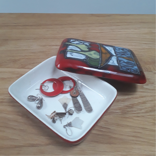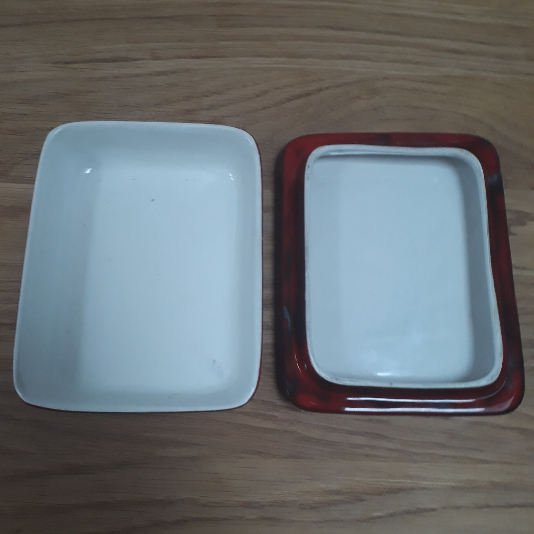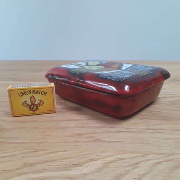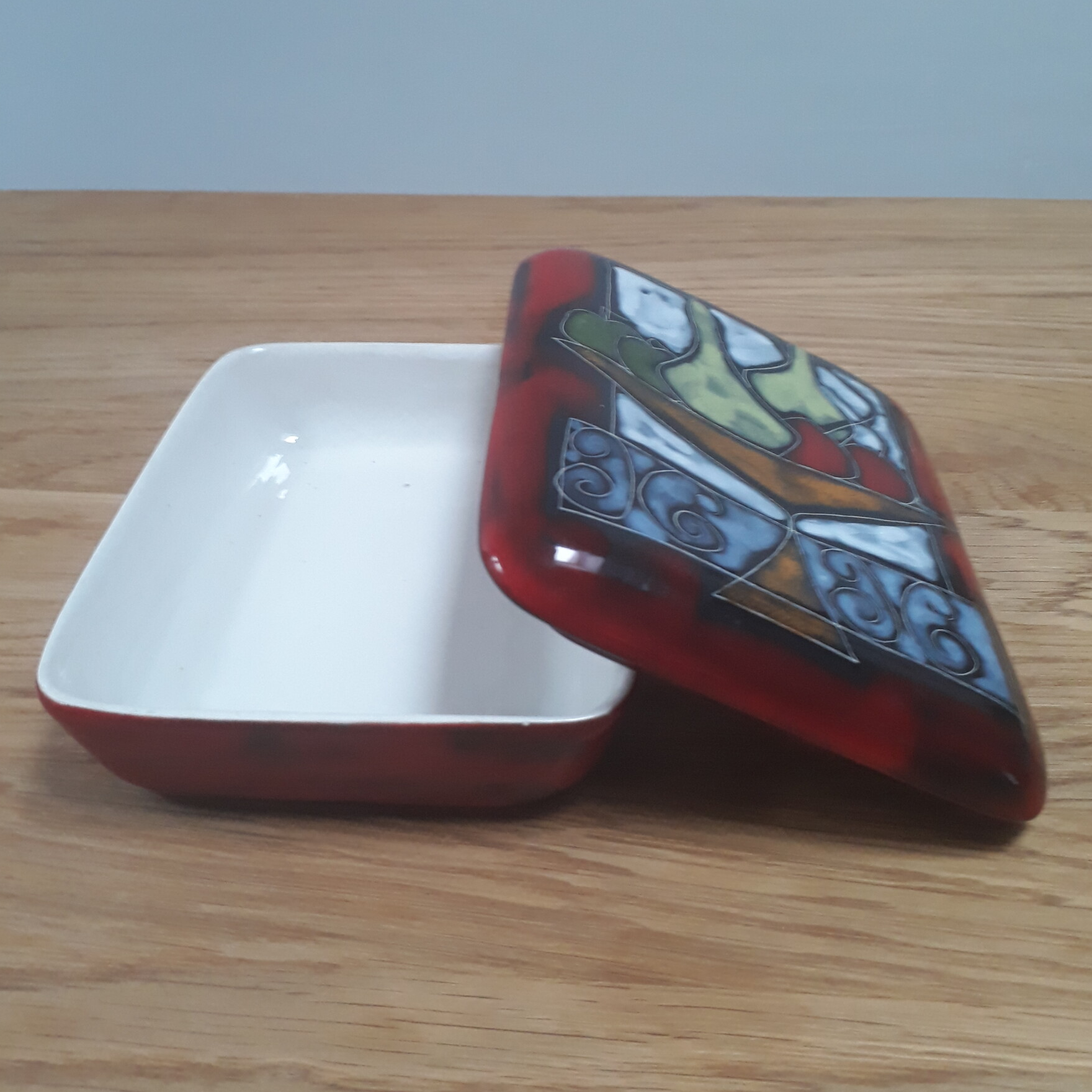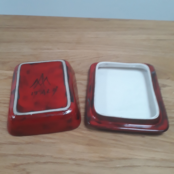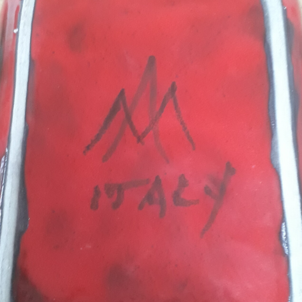 Beschrijving : Keramieken doosje, in felrood, met op deksel een fruitschaal-tafereel geschilderd. Vervaardigd in Italië (Gesigneerd onderaan). Ontwerper: Antonio Milani, vermoedelijk jaren '50.