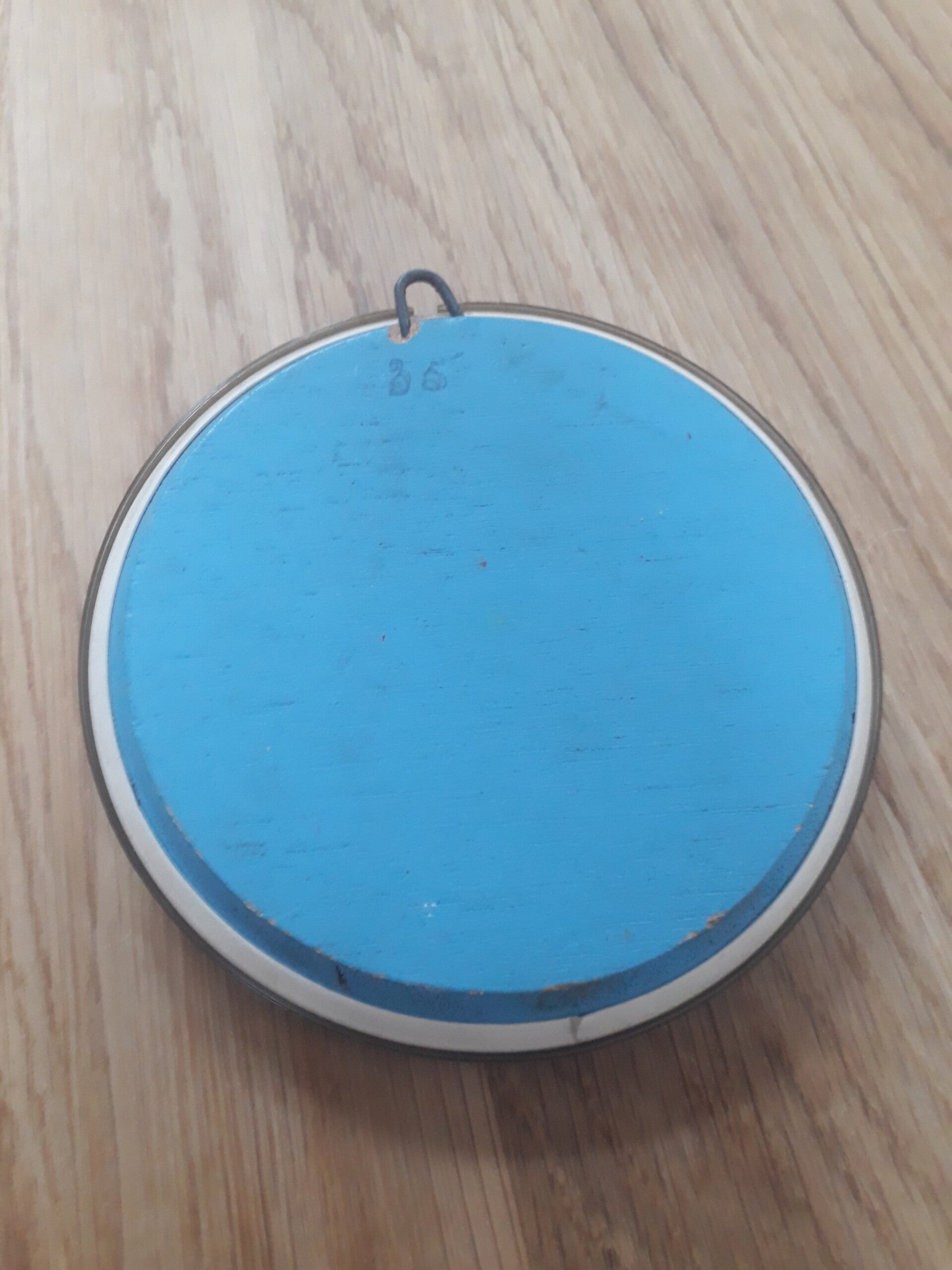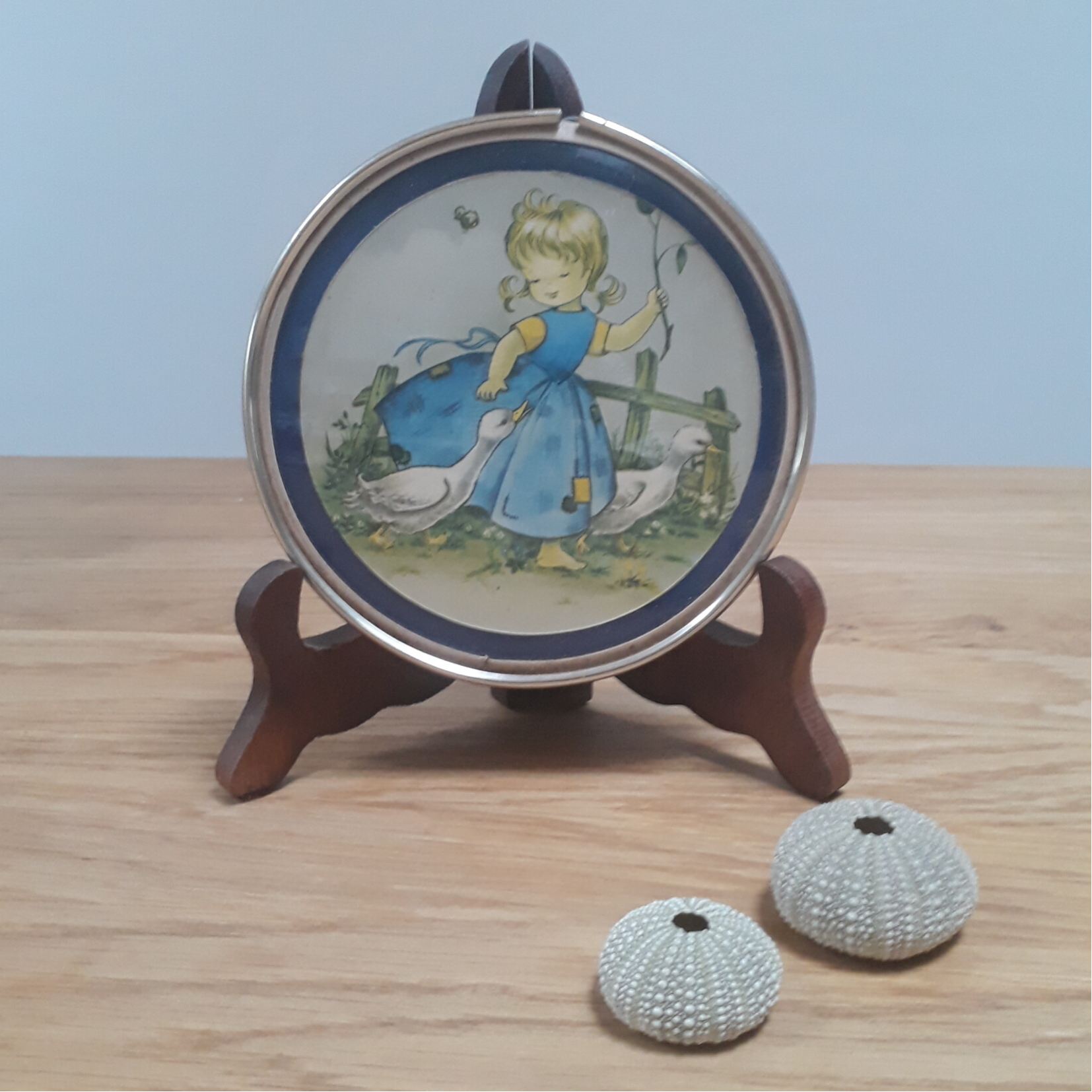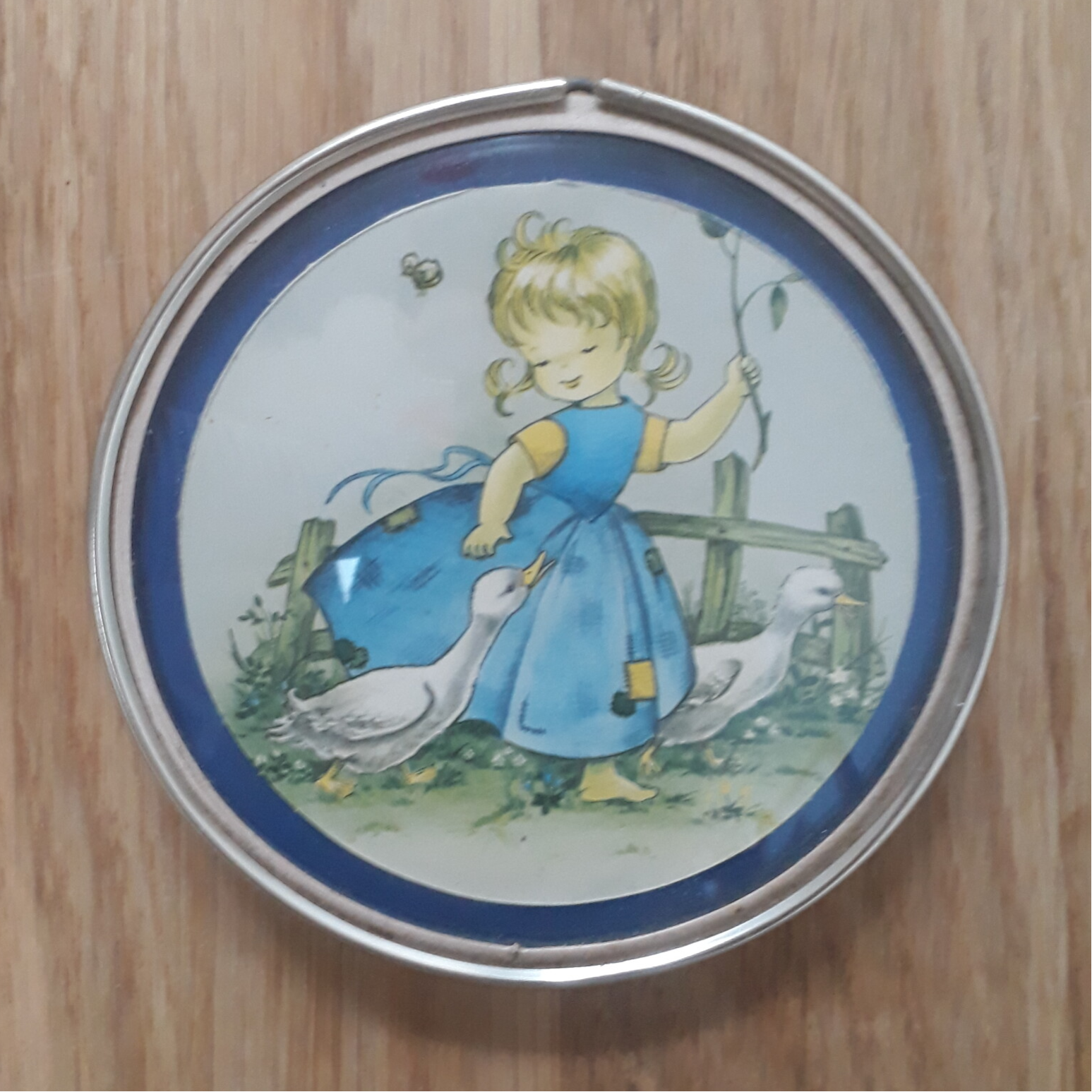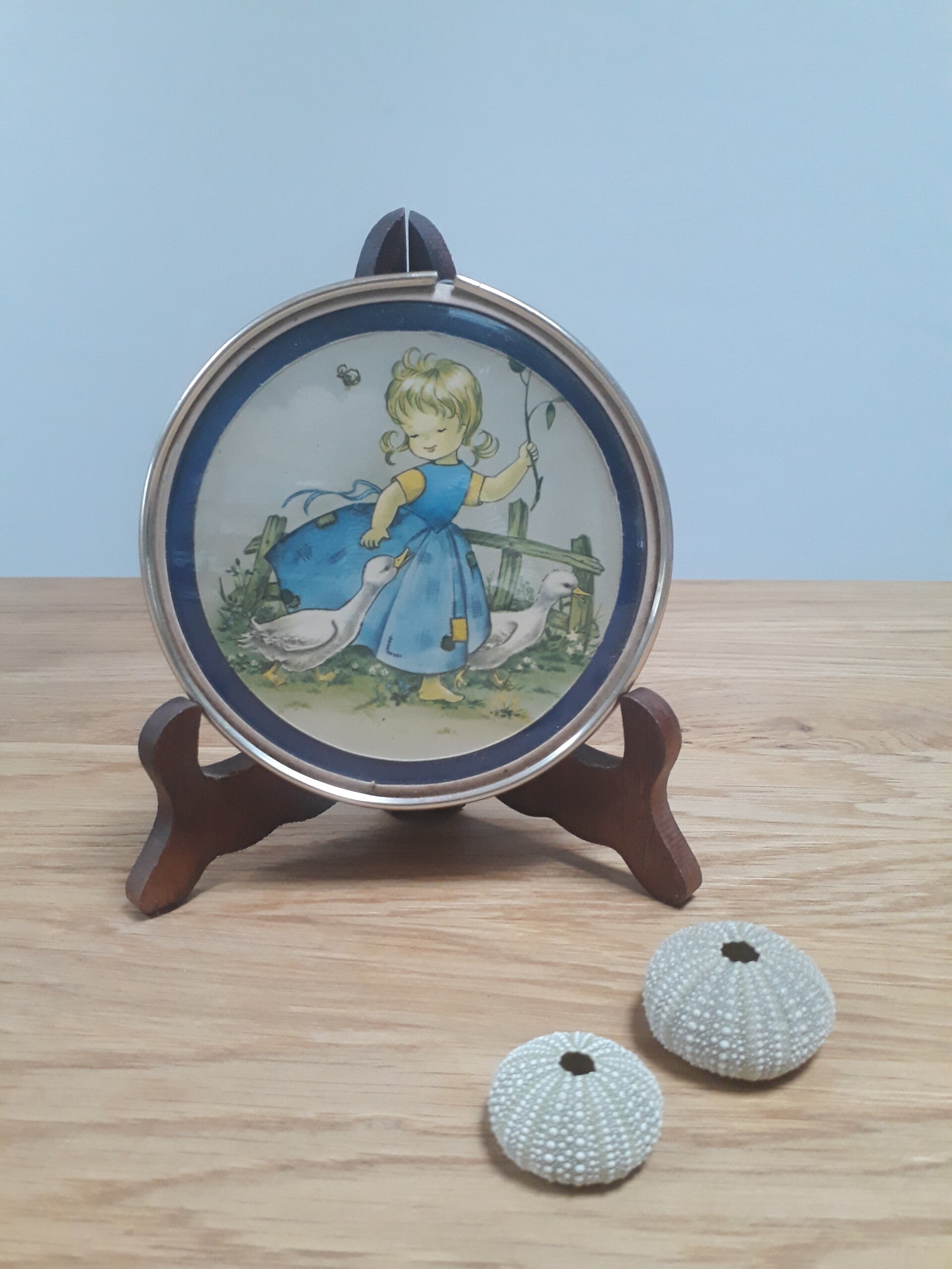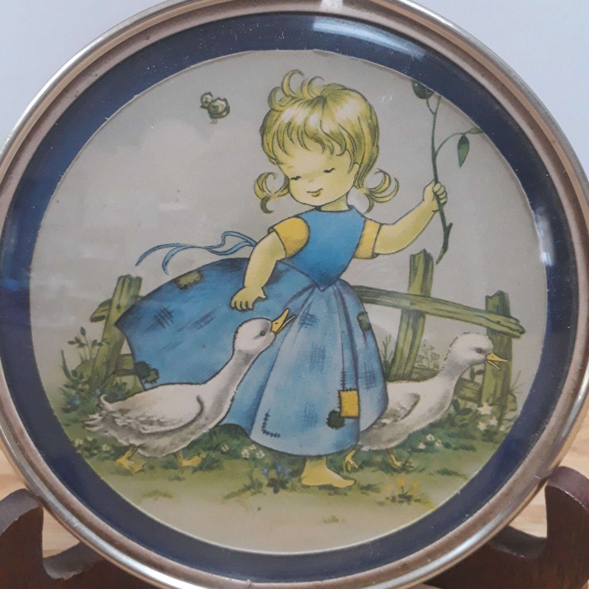 Beschrijving : Wanddecoratie: jeugdtafereeltje in kadertje met bol glas. Binnenin staat een spelend meisje afgebeeld met 2 ganzen/eenden om haar heen, blauw-groen-wit-geel. Aan de achterzijde een haakje om het aan de muur te kunnen hangen.