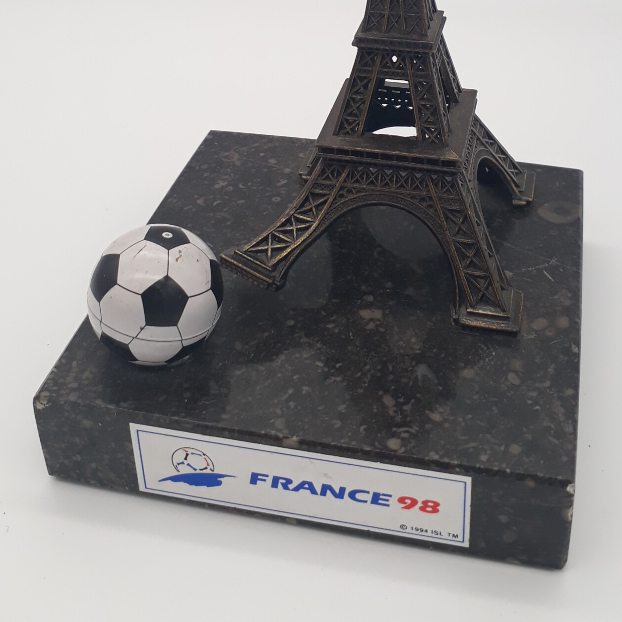 Beschrijving : Gewoon een hebbeding, de eifeltoren die voetbalt, een souvenier van het wereldkampioenschap voetbal in Frankrijk, 1998 (FIFA). Onderaan voorzien van de nodige labels.