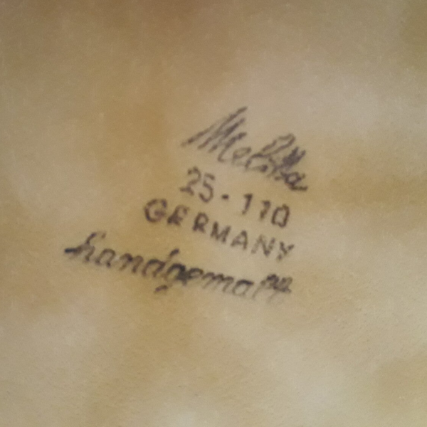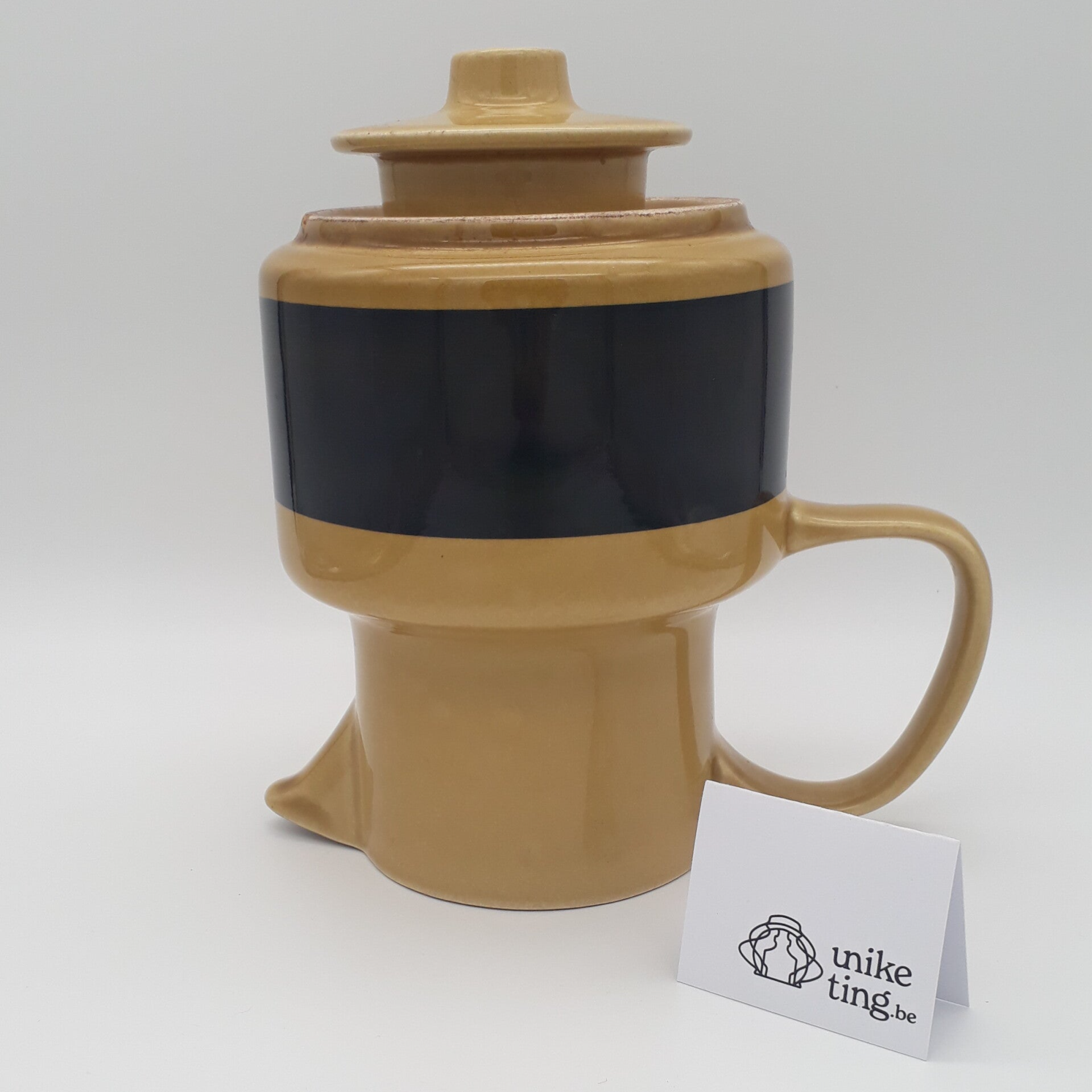 Beschrijving : Bruin-beige of mosterdkleurige koffiekan, gemerkt "Melitta 25-110, Germany, handgemalt".