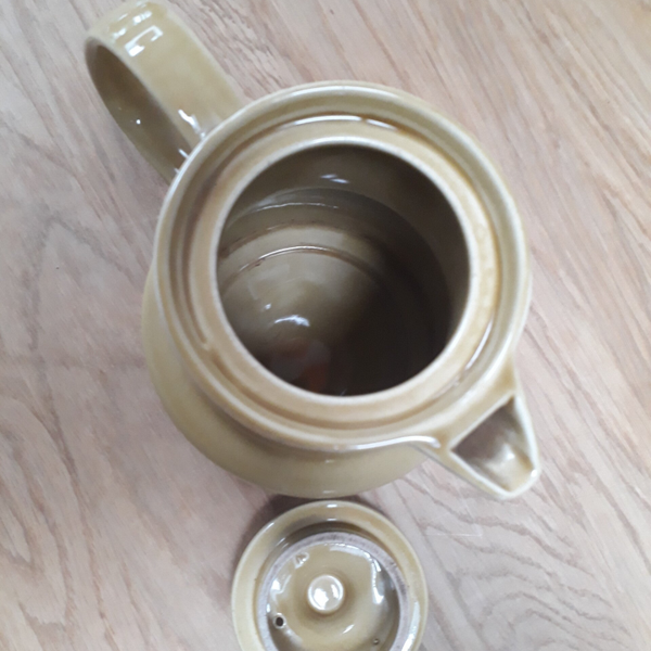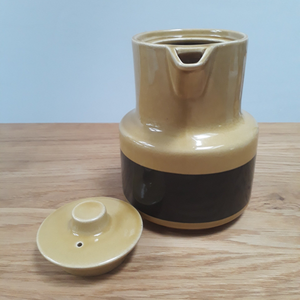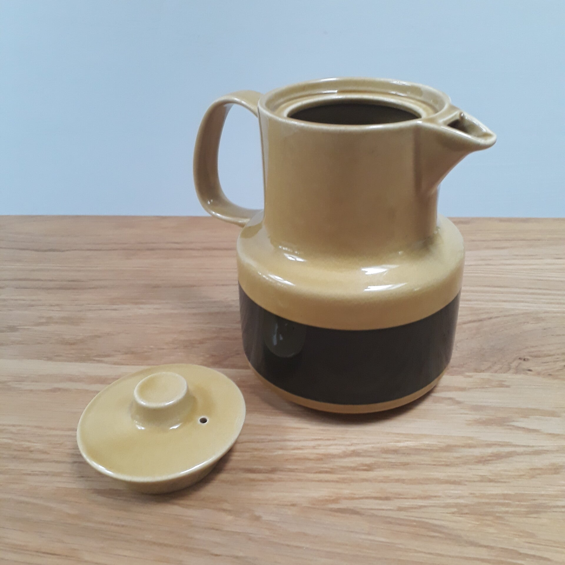 In de jaren ’50 bracht Melitta ook steeds vaker koffieservies op de markt. In 1954 werd hun iconisch pastelkleurig servies een schot in de roos (de tijd dat ook bij ons op de Expo ’58 deze kleuren floreerden). En ook in de daaropvolgende jaren waren ze steeds ‘on trend’ met hun serviezen. Zoals deze hier, in de warme mosterkleurige kleur die vooral in de jaren '70-'80 floreerde.