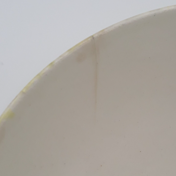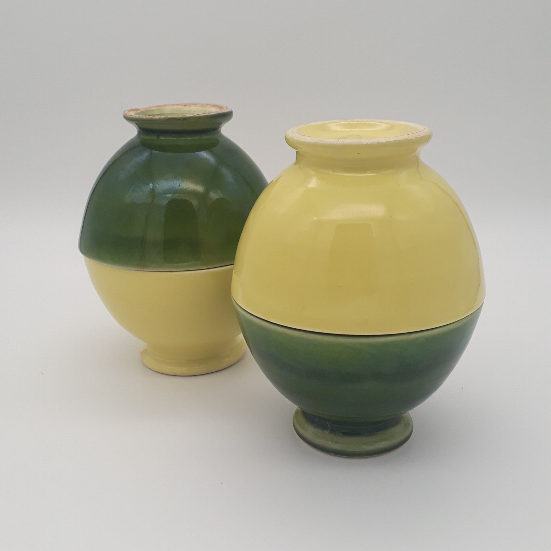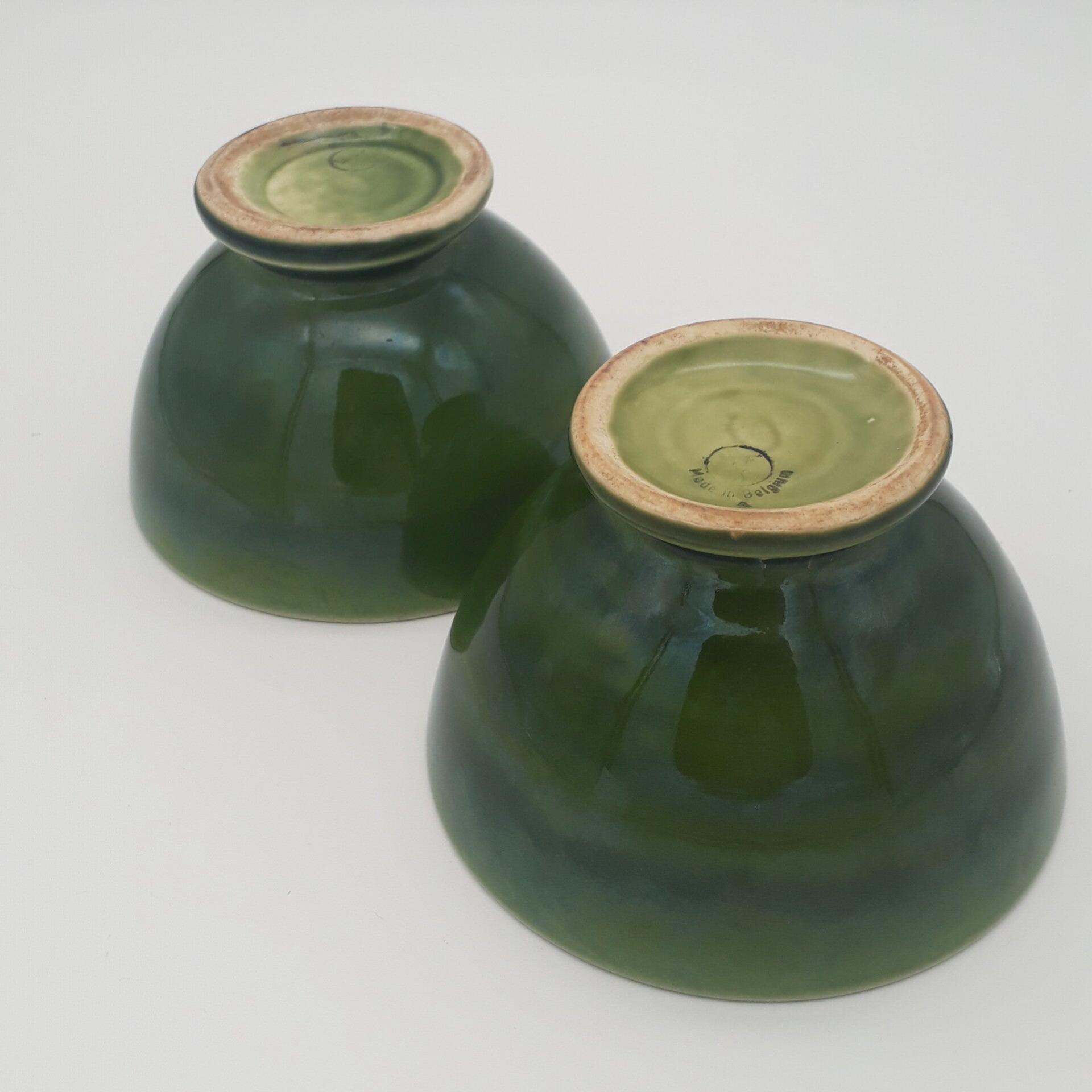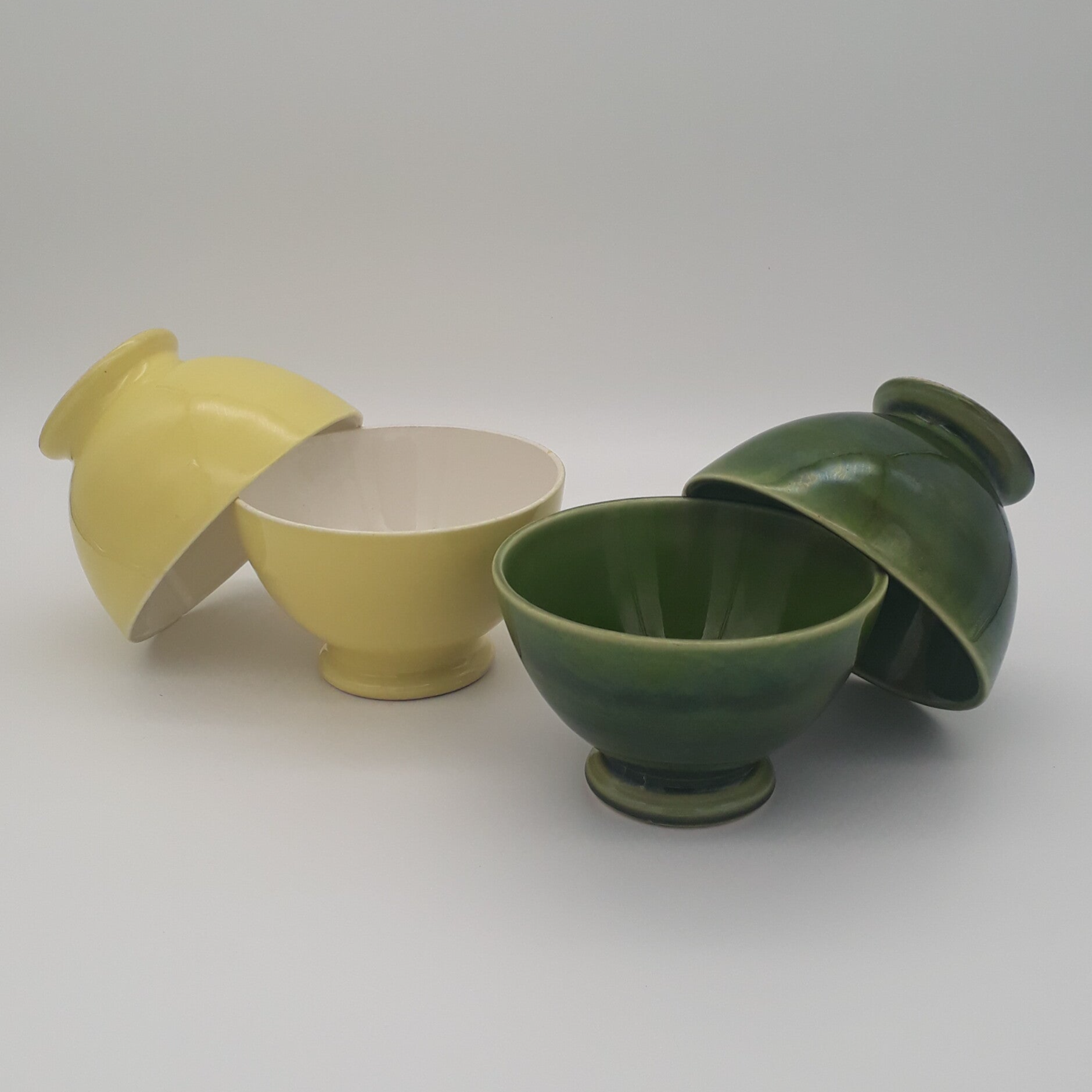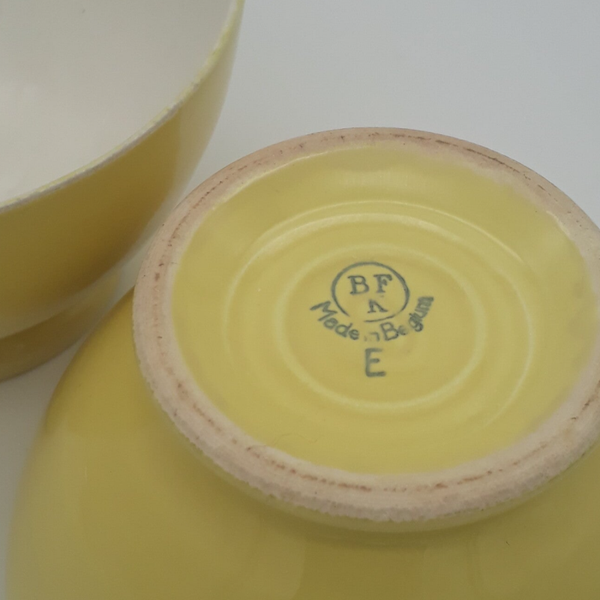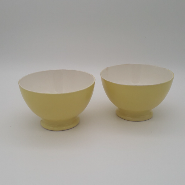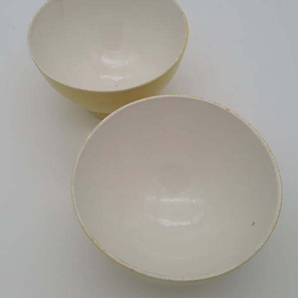 *Geel-witte duo : gezien de ouderdom zeer goeie conditie, één kommetje heeft een oneffenheid in het witte glazuur, het andere een haarlijn en mini chipje af (zie foto's)