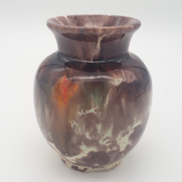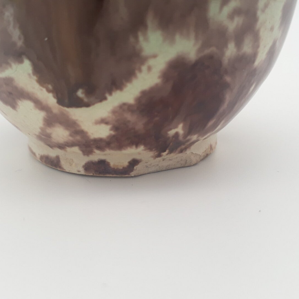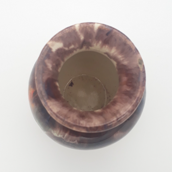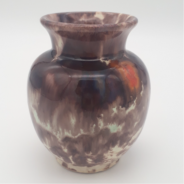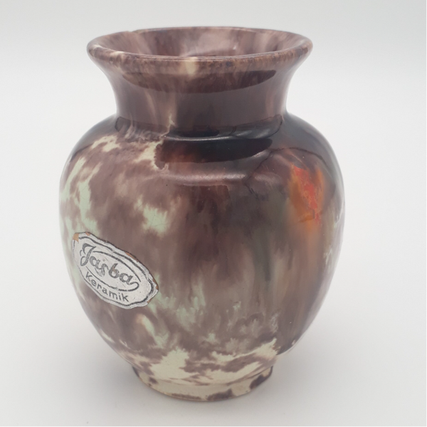 Beschrijving : Klein vaasje in auberginekleur gevlekte print. Gemerkt met sticker "Jasba keramik" en onderaan "Germany, 511/8". Dit type sticker en de vorm en kleur dateren het vaasje in de jaren '50.
